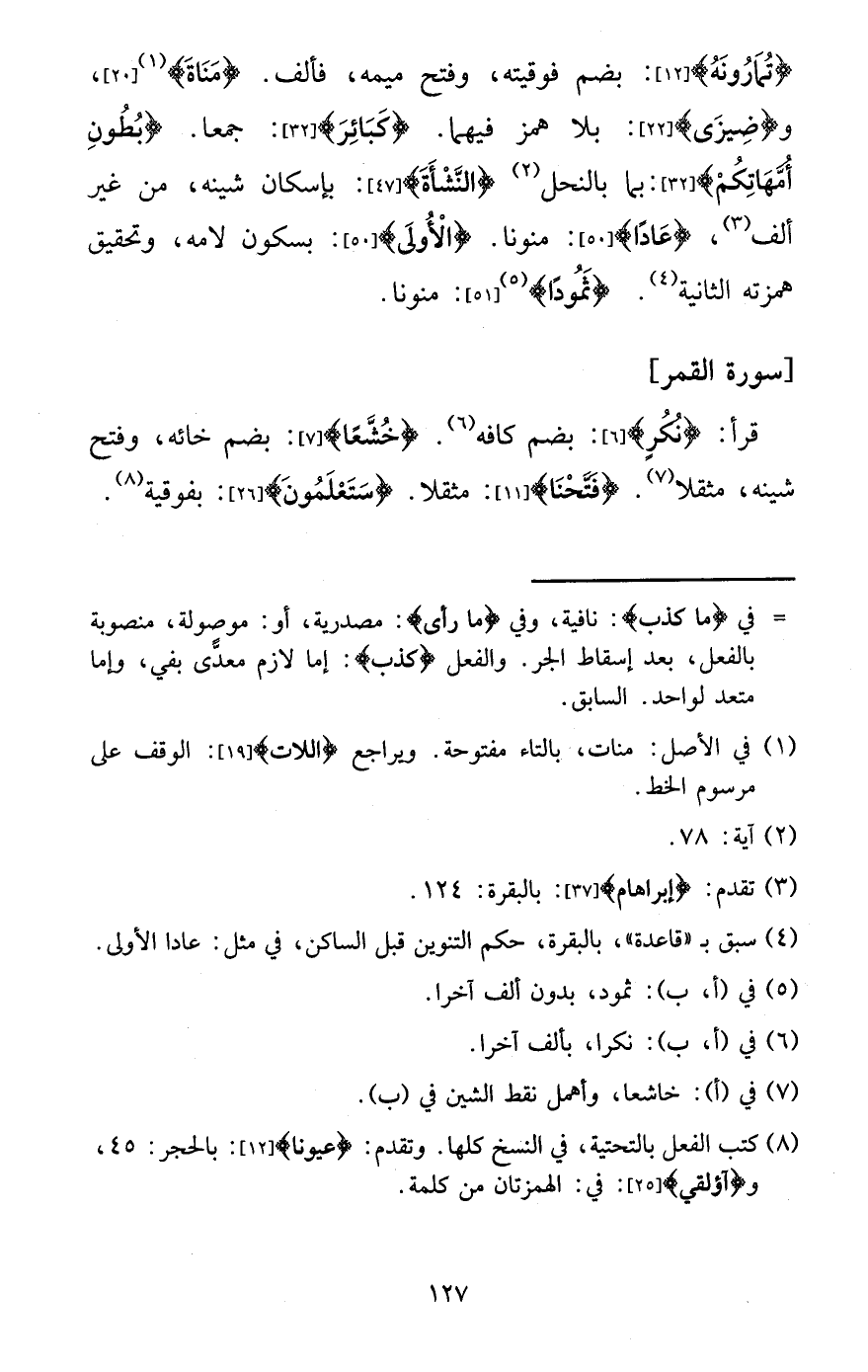 {تمارونه} : بِضَم فوقيته، وَفتح ميمه، فألف. {مَنَاة} ، و {ضيزى} : بِلَا همز فيهمَا. {كَبَائِر} : جمعا. {بطُون أُمَّهَاتكُم} : بِمَا بالنحل {النشأة} : بِإِسْكَان شينه، من غير ألف، {عادا} : منونا. {الأولى} : بِسُكُون لامه، وَتَحْقِيق همزته الثَّانِيَة. {ثمودا} : منونا. [