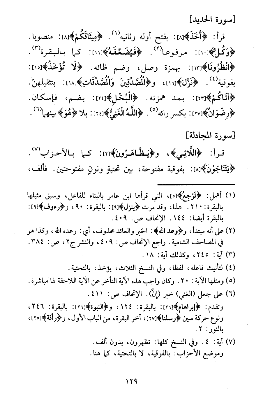 {وكل} : مَرْفُوعا. {فيضعفه} : كَمَا بالبقرة. {انظرونا} : بِهَمْزَة وصل، وَضم ظائه. {لَا تُؤْخَذ} : بفوقية. {نزل} ، و {المصدقين والمصدقات} : بتثقيلهن.