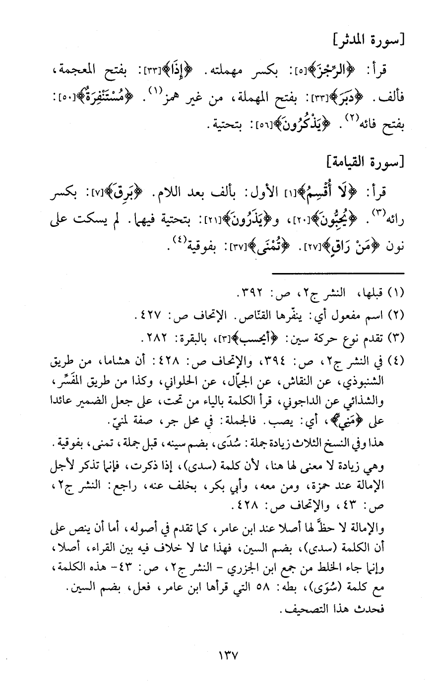 قَرَأَ: {الرجز} : بِكَسْر مهملته. {إِذا} : بِفَتْح الْمُعْجَمَة، فألف. {دبر} : بِفَتْح الْمُهْملَة، من غير همز. {مستنفرة} : بِفَتْح فائه. {يذكرُونَ} : بتحتية. [سُورَة الْقِيَامَة]