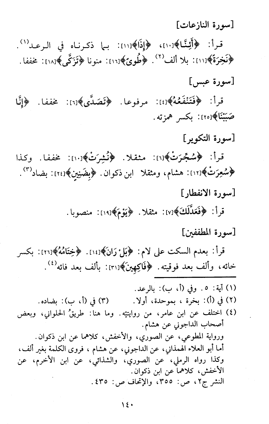 قَرَأَ: {أئنا} ، {إِذا} : بِمَا ذَكرْنَاهُ فِي الرَّعْد. {نخرة} : بِلَا ألف. {طوى} : منونا {تزكّى} : مخففا. [سُورَة عبس]