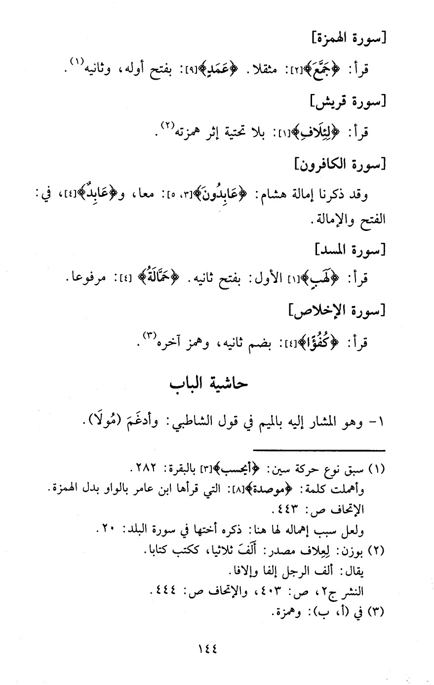 قَرَأَ: {لَهب} الأول: بِفَتْح ثَانِيه. {حمالَة} : مَرْفُوعا. [سُورَة الْإِخْلَاص]
