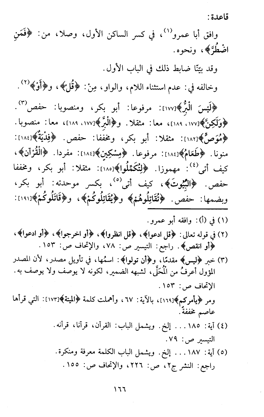 {موص} : مُثقلًا: أَبُو بكر، ومخففا: حَفْص. {فديَة} : منونا. {طَعَام} : مَرْفُوعا. {مِسْكين} : مُفردا. {الْقُرْآن} ، كَيفَ أَتَى: مهموزا. {لتكملوا} : مُثقلًا: أَبُو بكر، ومخففا حَفْص. {الْبيُوت} ، كَيفَ أَتَى، بِكَسْر موحدته: أَبُو بكر، وَبِضَمِّهَا: حَفْص. {تقاتلوهم} و {يُقَاتِلُوكُمْ} ، و {قَاتَلُوكُمْ} :