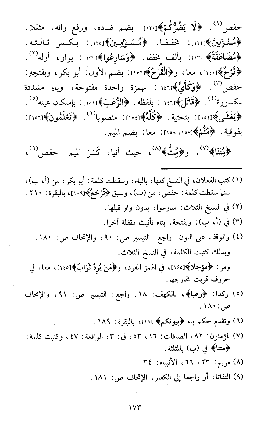 حَفْص. {لَا يضركم} : بِضَم ضاده، وَرفع رائه، مُثقلًا. {منزلين} : مخففا. {مسومين} : بِكَسْر ثالثه. {مضاعفة} : بِأَلف مخففا. {وسارعوا} : بواو، أَوله. {قرح} ، مَعًا، و {الْقرح} : بِضَم الأول: أَبُو بكر، وبفتحه: حَفْص. {وكأي} : بِهَمْزَة وَاحِدَة مَفْتُوحَة، وياء مُشَدّدَة مَكْسُورَة. {قَاتل} : بِلَفْظِهِ. {الرعب} : بِإِسْكَان عينه. {يغشى} : بتحتية. {كُله} : مَنْصُوبًا. {تعلمُونَ} : بفوقية. {متم} : مَعًا: بِضَم الْمِيم.