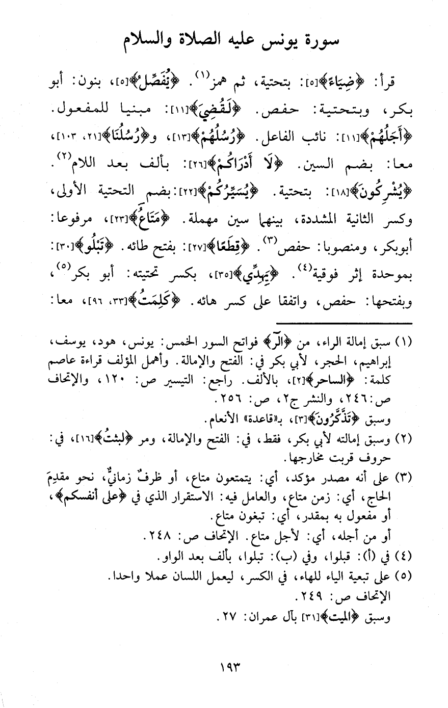 قَرَأَ: {ضِيَاء} : بتحتية، ثمَّ همز. {يفصل} ، بنُون: أَبُو بكر، وبتحتية: حَفْص. {لقضي} : مَبْنِيا للْمَفْعُول. {أَجلهم} : نَائِب الْفَاعِل. {رسلهم} ، و {رسلنَا} ، مَعًا: بِضَم السِّين. {لَا أدراكم} : بِأَلف بعد اللَّام. {يشركُونَ} : بتحتية. {يسيركم} : بِضَم التَّحْتِيَّة الأولى، وَكسر الثَّانِيَة الْمُشَدّدَة، بَينهمَا سين مُهْملَة. {مَتَاع} ، مَرْفُوعا: أَبُو بكر، ومنصوبا: حَفْص. {قطعا} : بِفَتْح طائه. {تبلو} : بموحدة إِثْر فوقية. {يهدي} ، بِكَسْر تحتيته: أَبُو بكر، وَبِفَتْحِهَا: حَفْص، واتفقا على كسر هائه. {كلمت} ، مَعًا: