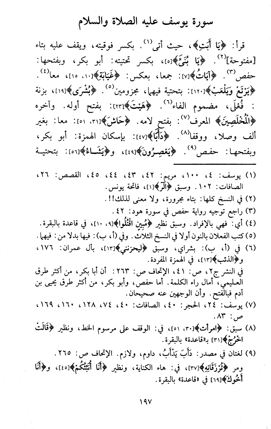 قَرَأَ: {يَا أَبَت} ، حَيْثُ أَتَى. بِكَسْر فوقيته، وَيقف عَلَيْهِ بتاء [مَفْتُوحَة] . {يَا بني} ، بِكَسْر تحتيته: أَبُو بكر، وَبِفَتْحِهَا: حَفْص. {آيَات} : جمعا: بعكس: {غيابة} ، مَعًا. {يرتع ويلعب} : بتحتية فيهمَا، مجزومين. {بشرى} ، بزنة: فعلى، مضموم الْفَاء. {هيت} : بِفَتْح أَوله. وَآخره {المخلصين} الْمُعَرّف. بِفَتْح لامه. {حاش} : مَعًا: بِغَيْر ألف وصلا، ووقفا. {دأبا} : بِإِسْكَان الْهمزَة: أَبُو بكر، وَبِفَتْحِهَا: حَفْص. {يعصرون} ، و {يَشَاء} : بتحتية