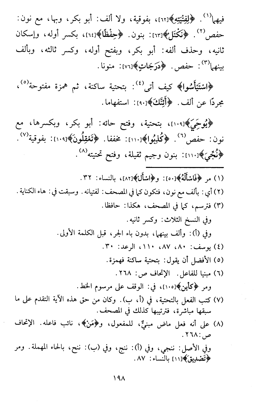 فيهمَا. {لفتيته} ، بفوقية، وَلَا ألف: أَبُو بكر، وَبهَا، مَعَ نون: حَفْص. {نكتل} : بنُون. {حفظا} ، بِكَسْر أَوله، وَإِسْكَان ثَانِيه، وَحذف أَلفه: أَبُو بكر، وبفتح أَوله، وَكسر ثالثه، وبألف بَينهمَا: حَفْص. {دَرَجَات} : منونا.