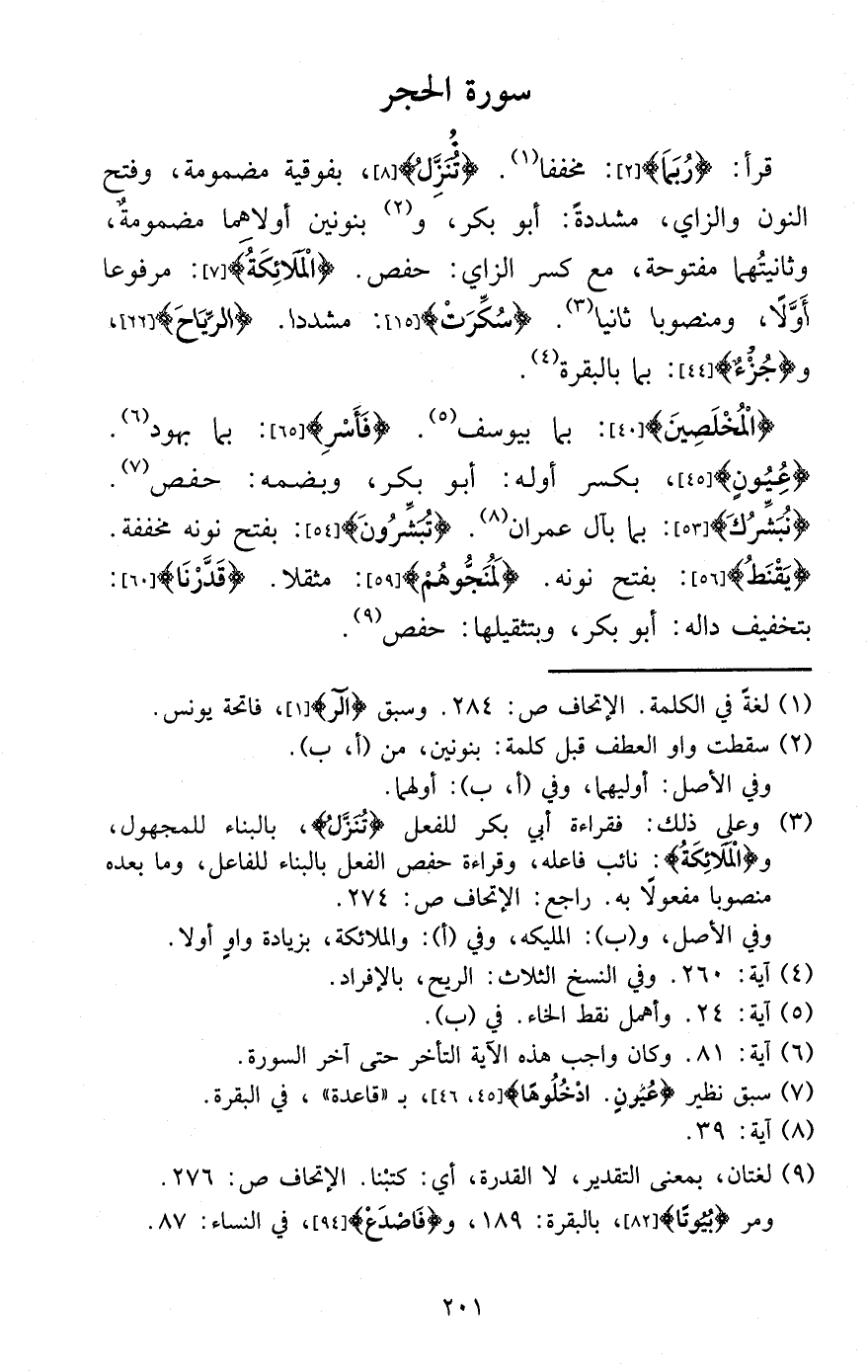 قَرَأَ: {رُبمَا} : مخففا. {تنزل} ، بفوقية مَضْمُومَة، وَفتح النُّون وَالزَّاي، مُشَدّدَة: أَبُو بكر، وبنونين أولاهما مَضْمُومَة، وثانيتهما مَفْتُوحَة، مَعَ كسر الزَّاي: حَفْص. {الْمَلَائِكَة} : مَرْفُوعا أَولا، ومنصوبا ثَانِيًا. {سكرت} : مشددا. {الرِّيَاح} ، و {جُزْء} : بِمَا بالبقرة.