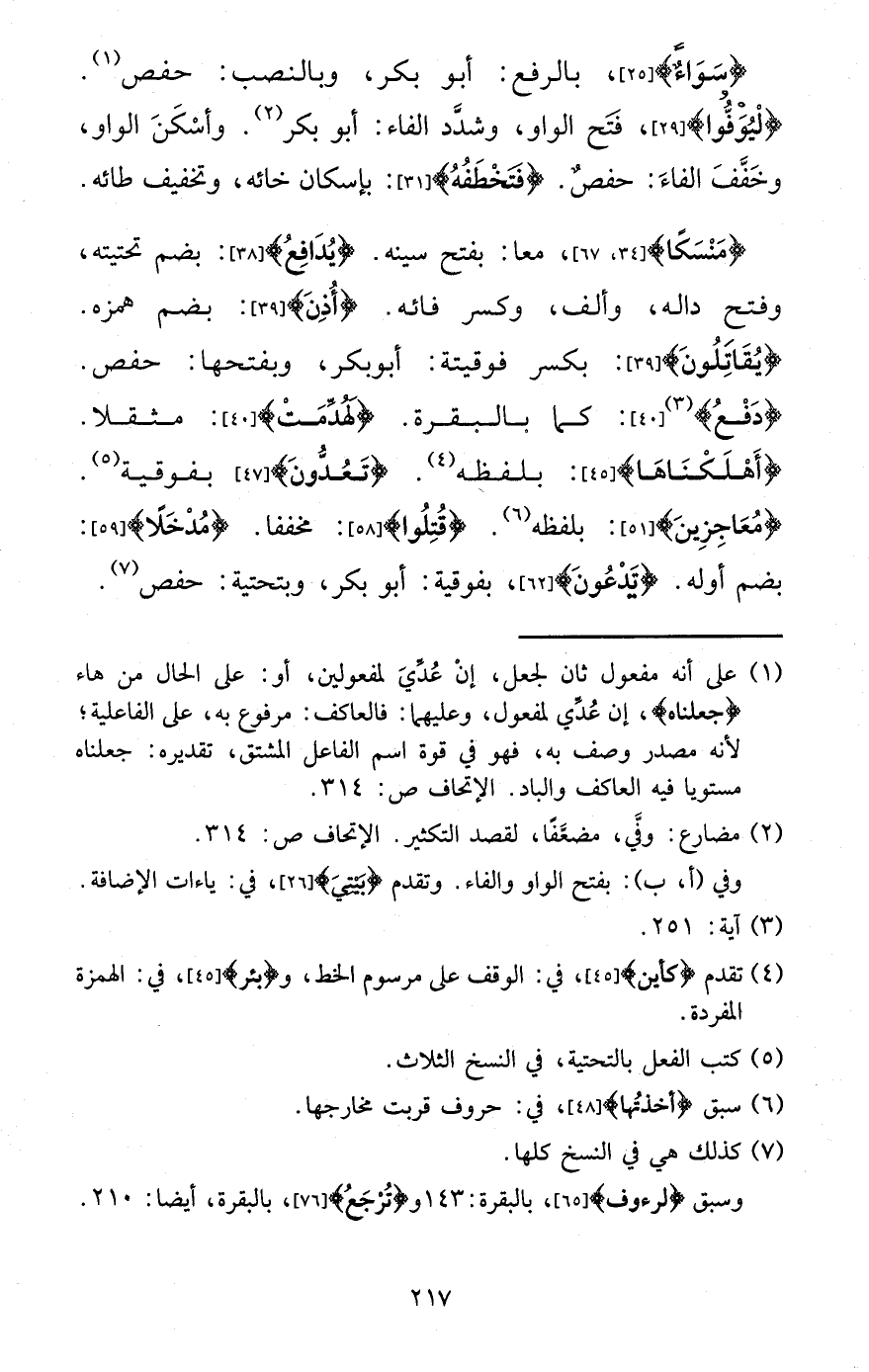 {سَوَاء} ، بِالرَّفْع: أَبُو بكر، وَبِالنَّصبِ: حَفْص. {ليوفوا} ، فتح الْوَاو، وشدد الْفَاء: أَبُو بكر. واسكن الْوَاو، وخفف الْفَاء: حَفْص. {فتخطفه} : بِإِسْكَان خائه، وَتَخْفِيف طائه.