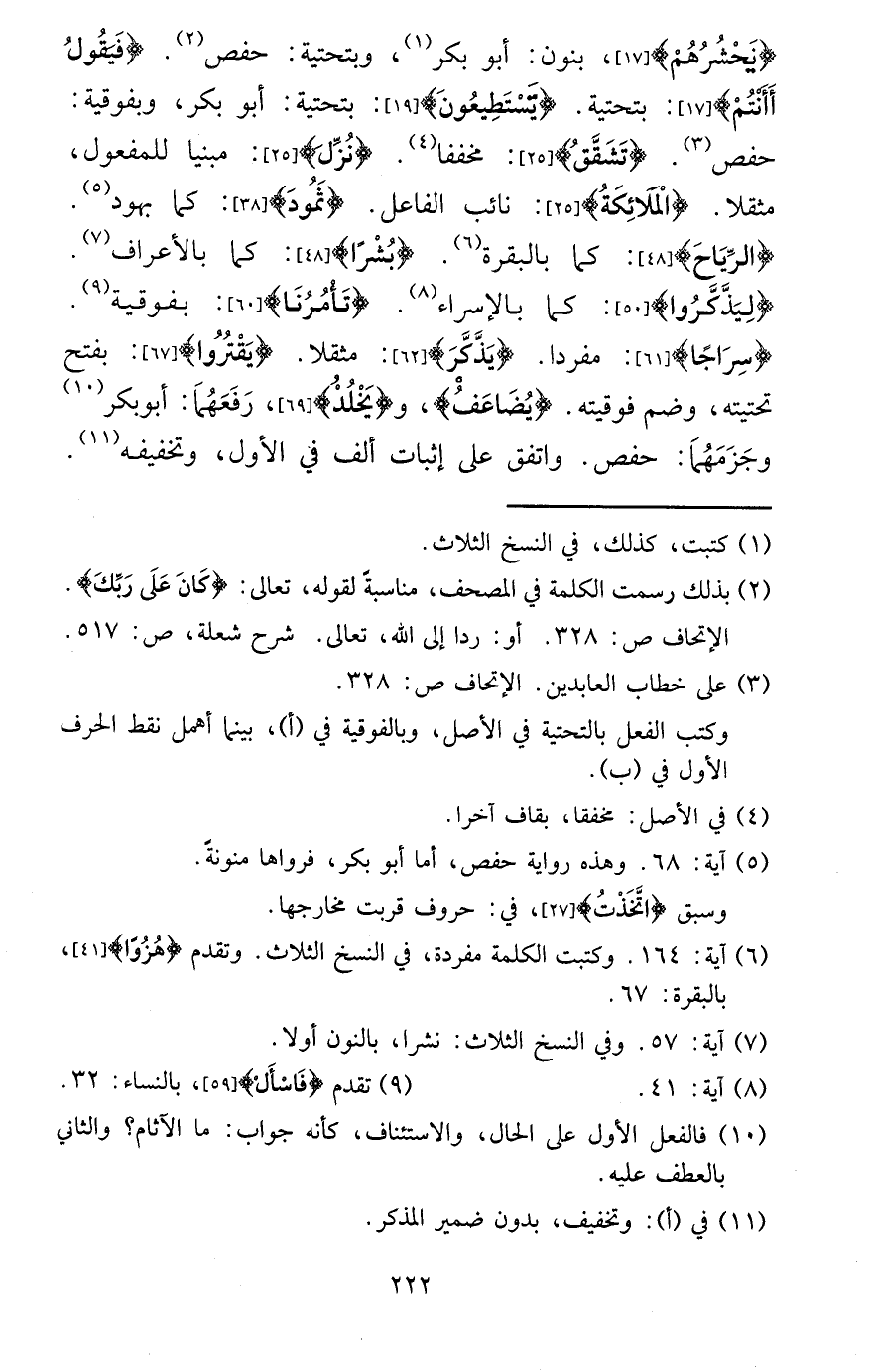 {يحشرهم} ، بنُون: أَبُو بكر، وبتحتية: حَفْص. {فَيَقُول أأنتم} : بتحتية. {يَسْتَطِيعُونَ} : بتحتية: أَبُو بكر، وبفوقية: حَفْص. {تشقق} : مخففا. {نزل} : مَبْنِيا للْمَفْعُول، مُثقلًا. {الْمَلَائِكَة} : نَائِب الْفَاعِل. {ثَمُود} : كَمَا بهود. {الرِّيَاح} : كَمَا بالبقرة. {بشرا} : كَمَا بالأعراف. {لِيذكرُوا} : كَمَا بالإسراء. {تَأْمُرنَا} : بفوقية. {سِرَاجًا} : مُفردا. {يذكر} : مُثقلًا. {يقترُوا} : بِفَتْح تحتيته، وَضم فوقيته. {يُضَاعف} ، و {يخلد} ، رفعهما: أَبُو بكر وجزمهما: حَفْص. وَاتفقَ على إِثْبَات ألف فِي الأول، وتخفيفه.
