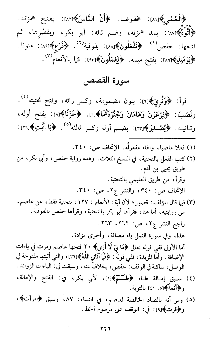 قَرَأَ: {ونري} : بنُون مَضْمُومَة، وَكسر رائه، وَفتح تحتيته. وَنصب: {فِرْعَوْن وهامان وجنودهما} . {حزنا} : بِفَتْح أَوله، وثانيه. {يصدر} : بِضَم أَوله وَكسر ثالثه. {يَا أَبَت} :