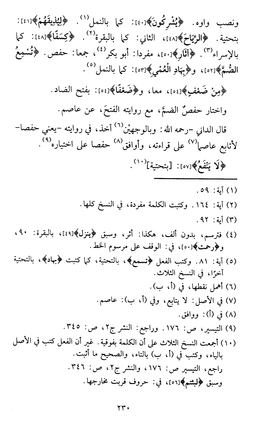 وَنصب واوه. {يشركُونَ} : كَمَا بالنمل. {ليذيقهم} : بتحتية. {الرِّيَاح} ، الثَّانِي: كَمَا بالبقرة. {كسفا} : كَمَا بالإسراء. {آثَار} ، مُفردا: أَبُو بكر، جمعا: حَفْص. {تسمع الصم} ، و {بهاد الْعمي} : كَمَا بالنمل.