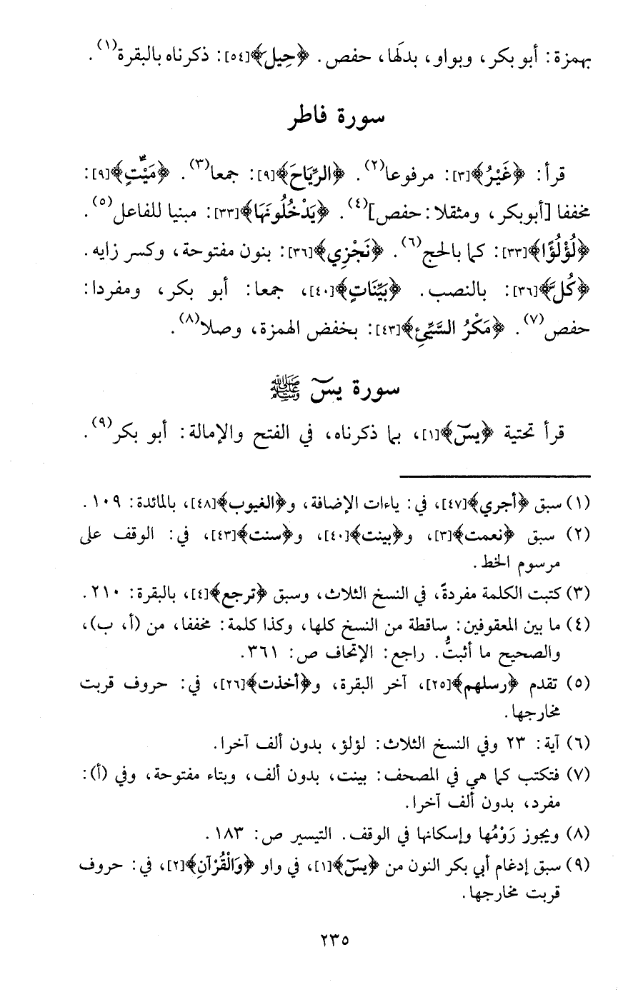 قَرَأَ: {غير} : مَرْفُوعا. {الرِّيَاح} : جمعا. {ميت} : مخففا [أَبُو بكر، ومثقلا: حَفْص] . {يدْخلُونَهَا} : مَبْنِيا للْفَاعِل. {لؤلؤاً} : كَمَا بِالْحَجِّ. {نجزي} : بنُون مَفْتُوحَة، وَكسر زايه. {كل} : بِالنّصب. {بَيِّنَات} ، جمعا: أَبُو بكر، ومفردا: حَفْص. {مكر السَّيئ} : بخفض الْهمزَة، وصلا.