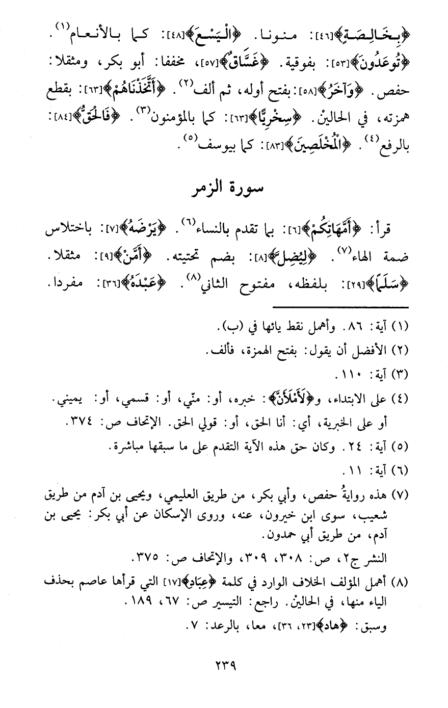 {بخالصة} : منونا. {اليسع} : كَمَا بالأنعام. {توعدون} : بفوقية. {غساق} ، مخففا: أَبُو بكر، ومثقلا: حَفْص. {وَآخر} : بِفَتْح أَوله، ثمَّ ألف. {أتخذناهم} : بِقطع همزته، فِي الْحَالين. {سخريا} : كَمَا بالمؤمنون. {فَالْحق} : بِالرَّفْع. {المخلصين} : كَمَا بِيُوسُف.