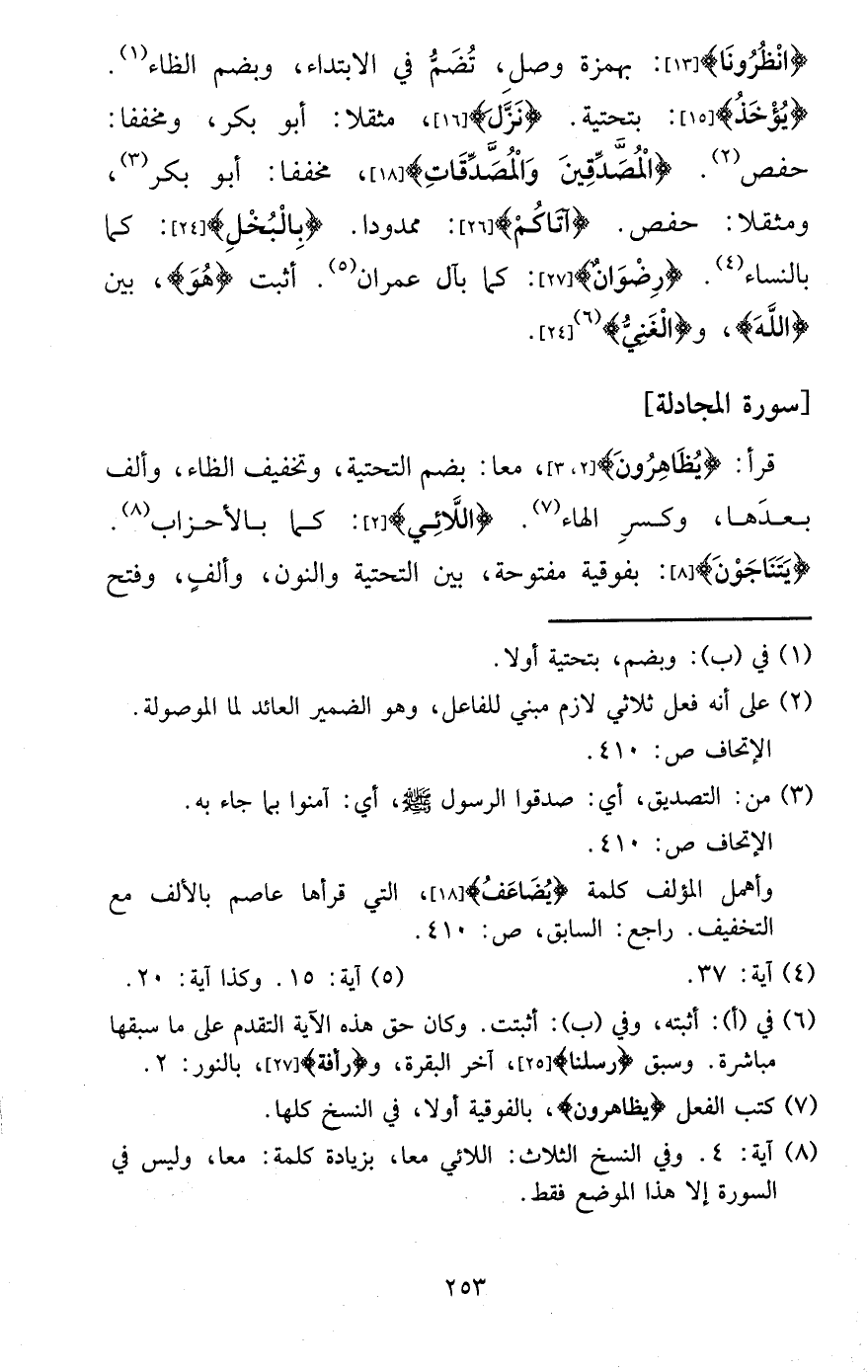 قَرَأَ: {يظاهرون} ، مَعًا: بِضَم التَّحْتِيَّة، وَتَخْفِيف الظَّاء، وَألف بعْدهَا، وَكسر الْهَاء. {اللائي} : كَمَا بالأحزاب. {يتناجون} : بفوقية مَفْتُوحَة، بَين التَّحْتِيَّة وَالنُّون، وَألف، وَفتح