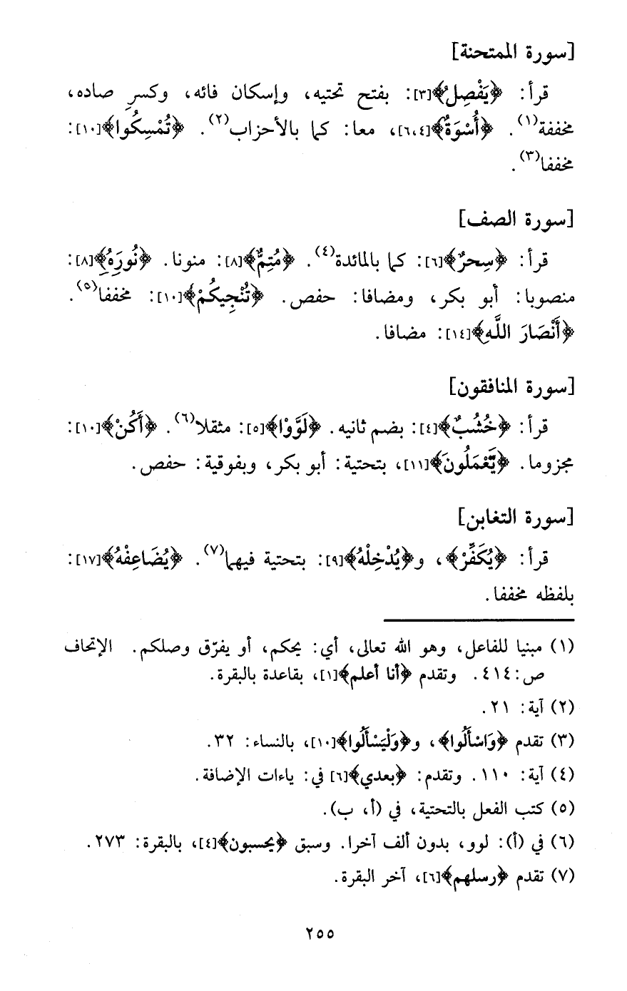 قَرَأَ: {يفصل} : بِفَتْح تحتيته، وَإِسْكَان فائه، وَكسر صَاده. مُخَفّفَة. {أُسْوَة} ، مَعًا: كَمَا بالأحزاب. {تمسكوا} : مخففا.