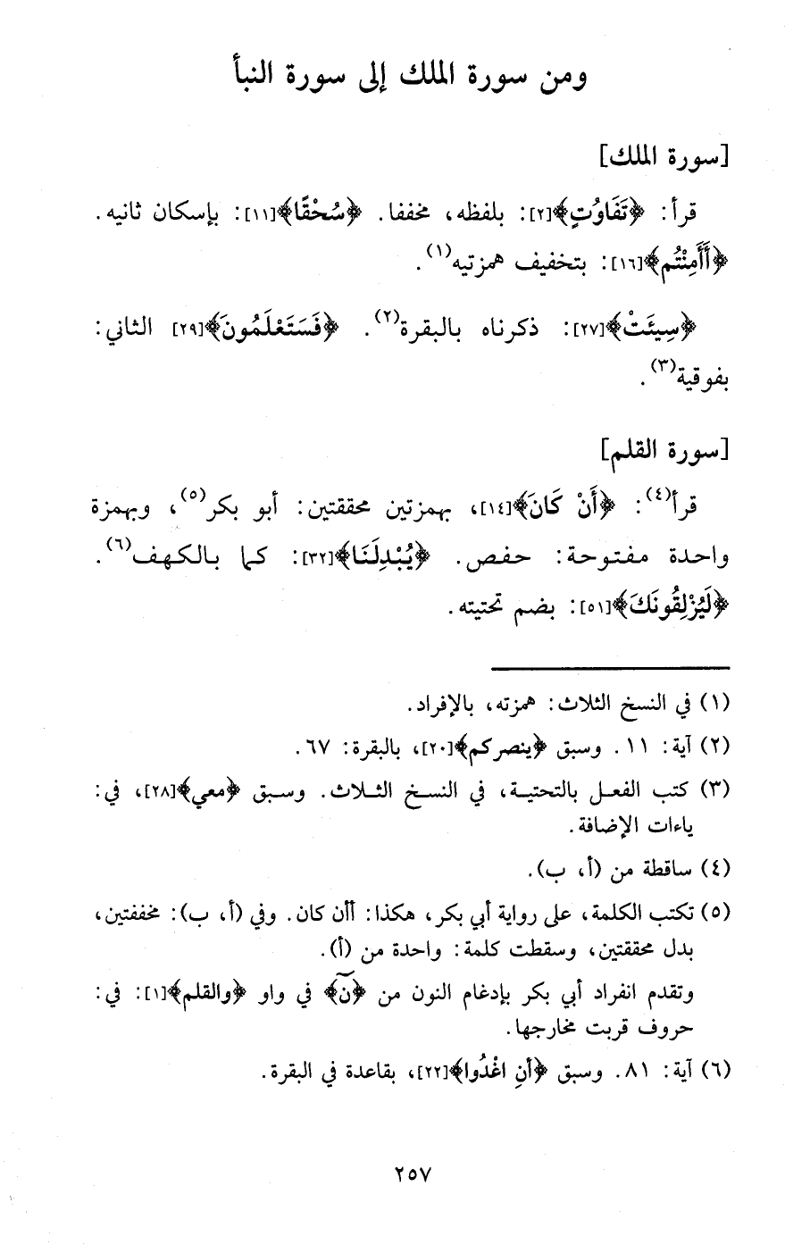 قَرَأَ: {تفَاوت} : بِلَفْظِهِ، مخففا. {سحقا} : بِإِسْكَان ثَانِيه. {أأمنتم} : بتَخْفِيف همزتيه.