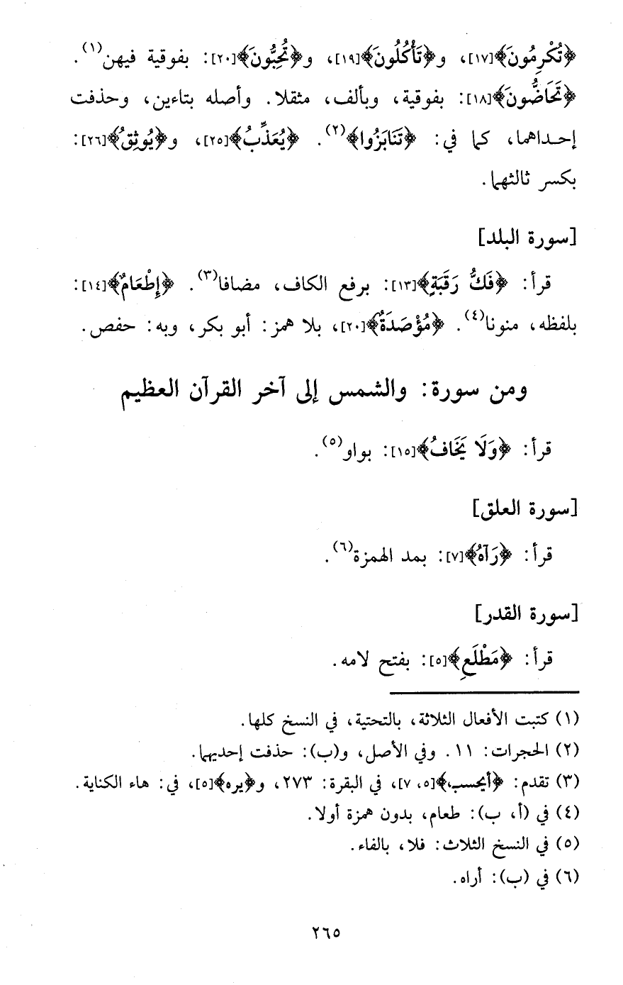 قَرَأَ: {فك رَقَبَة} : بِرَفْع الْكَاف، مُضَافا. {إطْعَام} : بِلَفْظِهِ: منونا. {مؤصدة} ، بِلَا همز: أَبُو بكر، وَبِه: حَفْص.