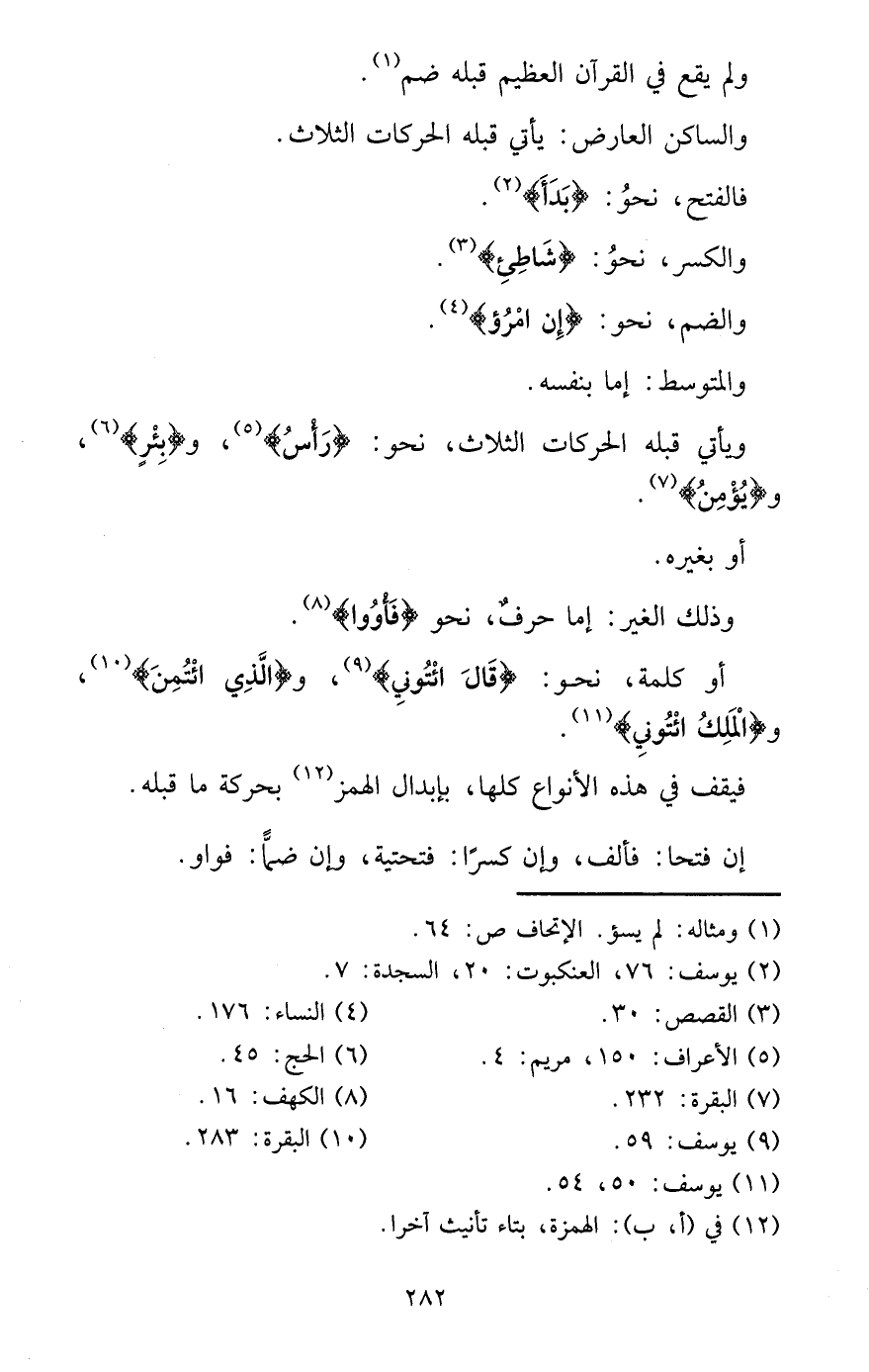 وَلم يَقع فِي الْقُرْآن الْعَظِيم قبله ضم. والساكن الْعَارِض: يَأْتِي قبله الحركات الثَّلَاث. فالفتح، نَحْو: {بَدَأَ} . وَالْكَسْر، نَحْو: {شاطئ} . وَالضَّم، نَحْو: {إِن امْرُؤ} . والمتوسط: إِمَّا بِنَفسِهِ.