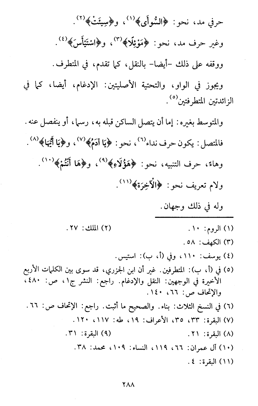 والمتوسط بِغَيْرِهِ: إِمَّا أَن يتَّصل السَّاكِن قبله بِهِ، رسما، أَو ينْفَصل عَنهُ. فالمتصل: يكون حرف نِدَاء، نَحْو: {يَا آدم} ، و {يَا أَيهَا} . وهاء، حرف التَّنْبِيه، نَحْو: {هَؤُلَاءِ} ، و {هَا أَنْتُم} . وَلَام تَعْرِيف نَحْو: {الْآخِرَة} . وَله فِي ذَلِك وَجْهَان.