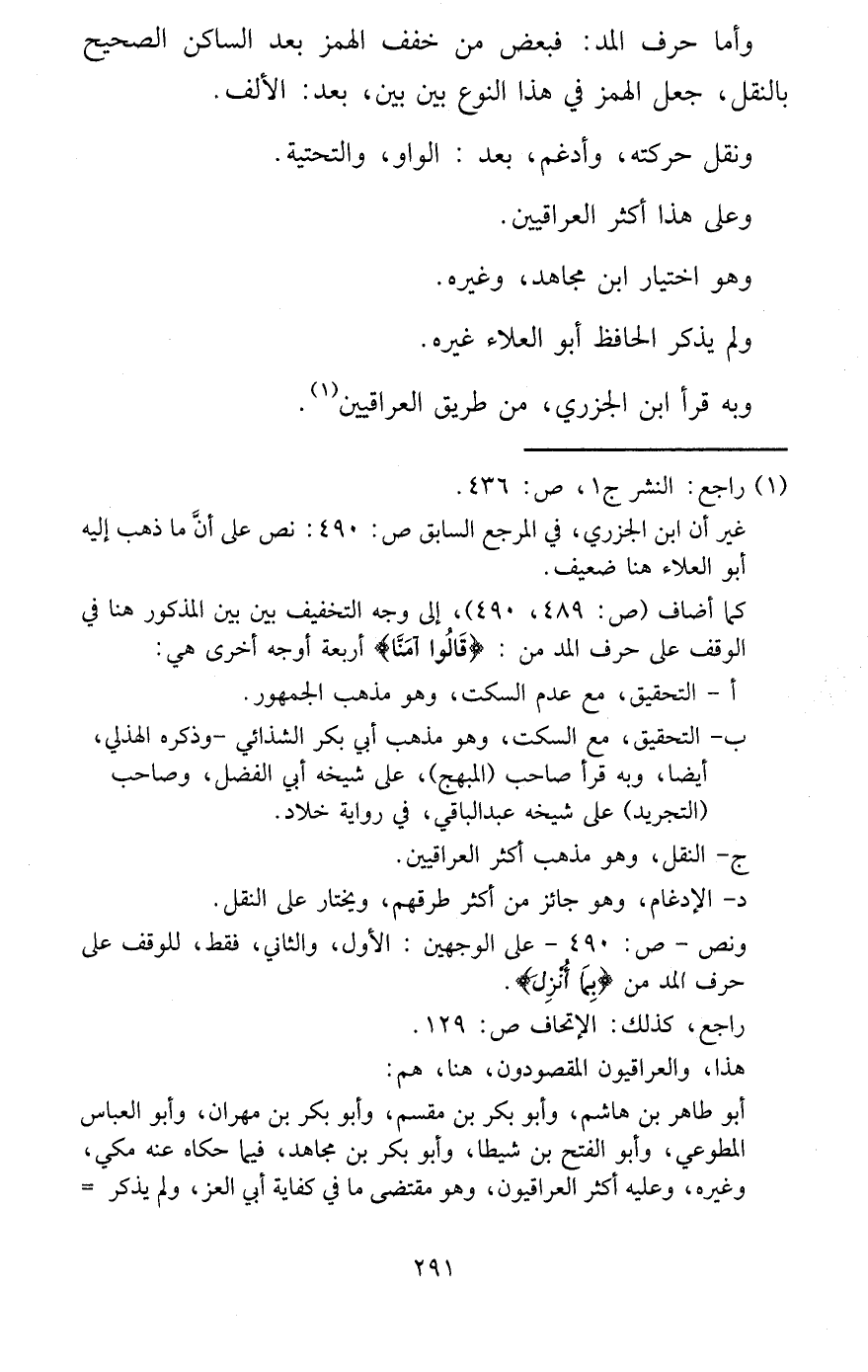 وَأما حرف الْمَدّ: فبعض من خفف الْهَمْز بعد السَّاكِن الصَّحِيح بِالنَّقْلِ، جعل الْهَمْز فِي هَذَا النَّوْع بَين بَين، بعد: الْألف. وَنقل حركته، وأدغم، بعد: الْوَاو، والتحتية. وعَلى هَذَا أَكثر الْعِرَاقِيّين. وَهُوَ اخْتِيَار ابْن مُجَاهِد، وَغَيره. وَلم يذكر الْحَافِظ أَبُو الْعَلَاء غَيره. وَبِه قَرَأَ ابْن الْجَزرِي، من طَرِيق الْعِرَاقِيّين.