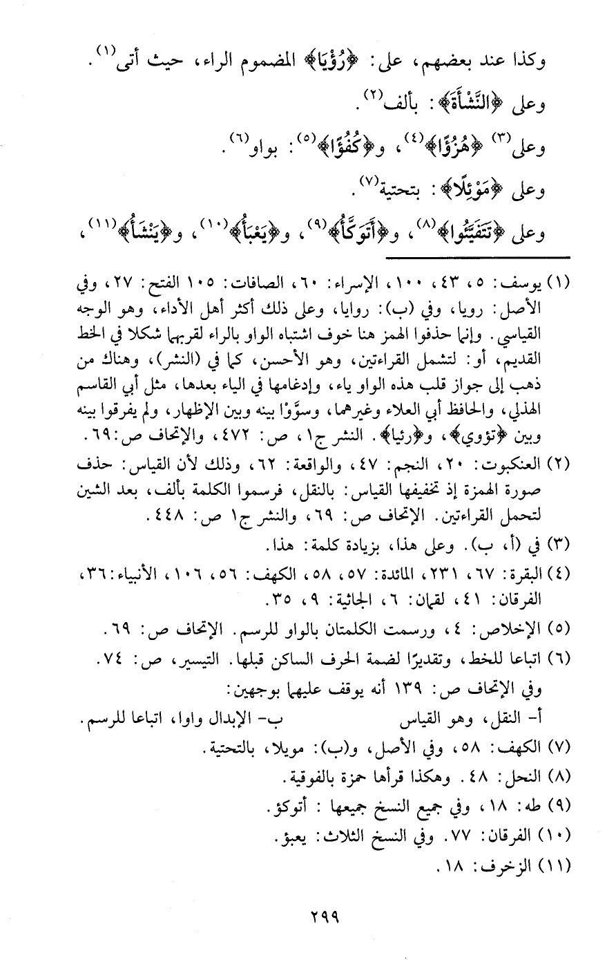 وَكَذَا عِنْد بَعضهم، على: {رُؤْيا} المضموم الرَّاء، حَيْثُ أَتَى. وعَلى {النشأة} : بِأَلف. وعَلى {هزؤاً} ، و {كُفؤًا} : بواو. وعَلى {موئلا} : بتحتية.