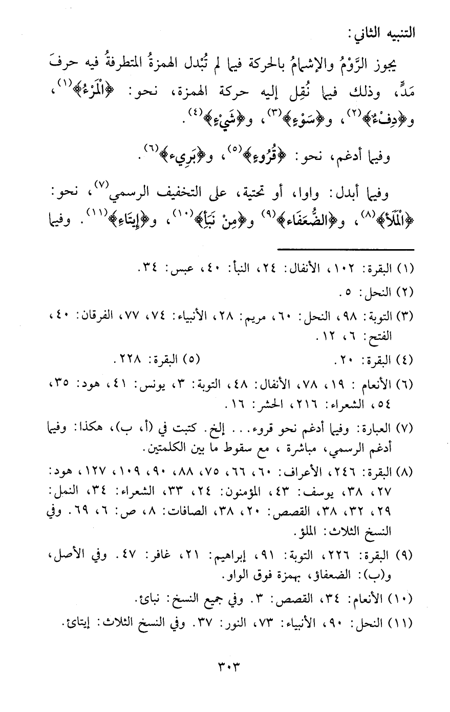 وَفِيمَا أبدل: واوا، أَو تحتية، على التَّخْفِيف الرسمي، نَحْو: {الْمَلأ} ، و {الضُّعَفَاء} و {من نبأ} ، و {إيتَاء} . وَفِيمَا
