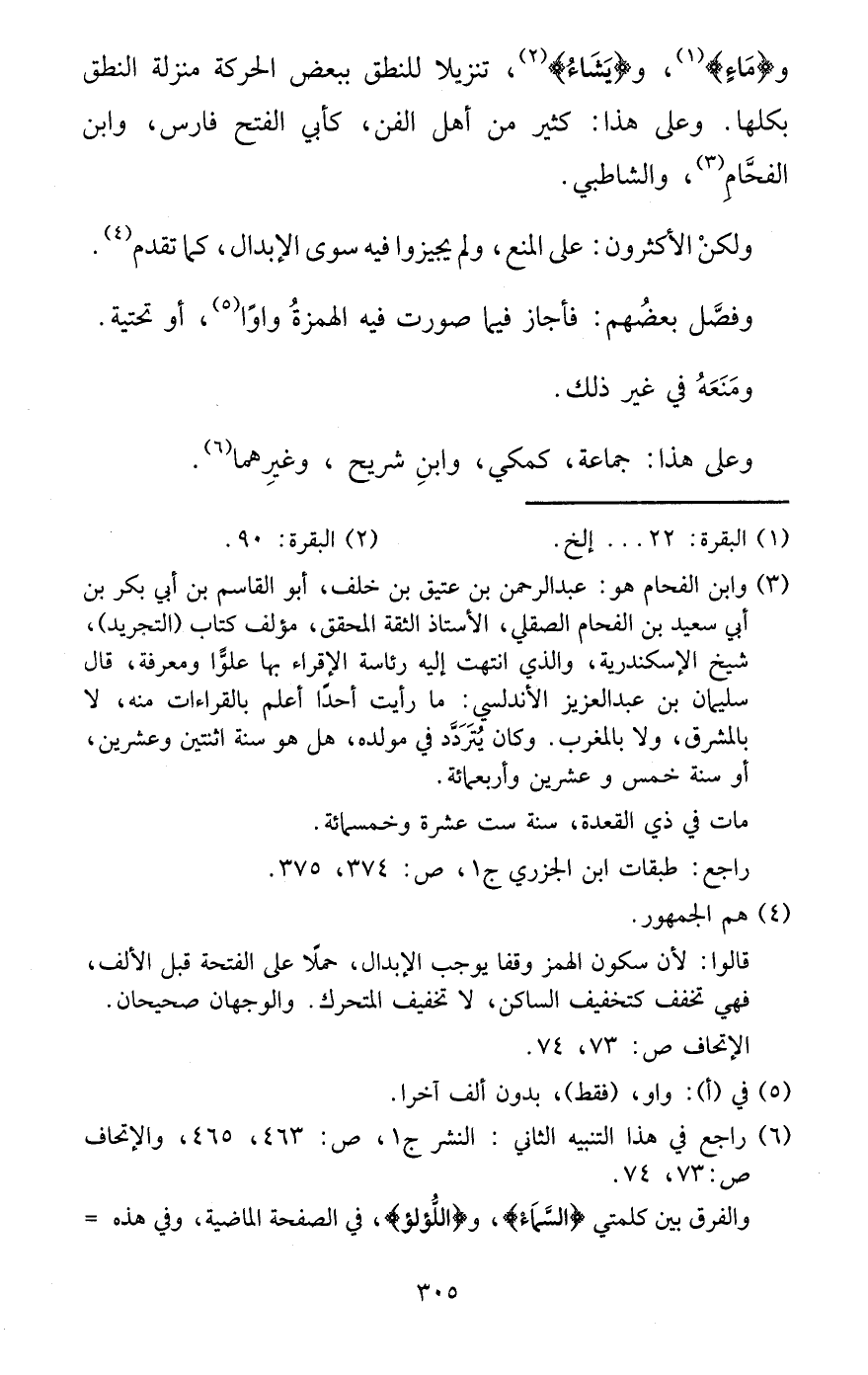 و {مَاء} ، و {يَشَاء} ، تَنْزِيلا للنطق بِبَعْض الْحَرَكَة منزلَة النُّطْق بكلها. وعَلى هَذَا: كثير من أهل الْفَنّ، كَأبي الْفَتْح فَارس، وَابْن الفحام، والشاطبي.