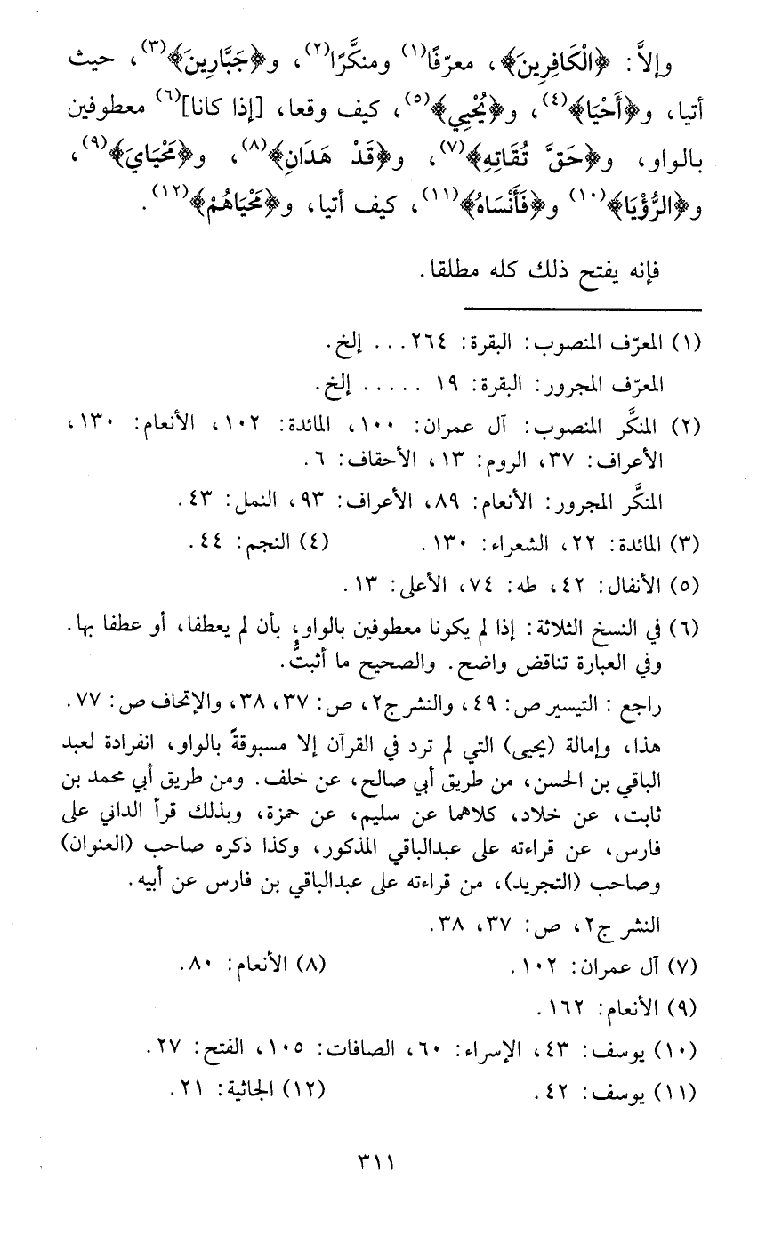 وَإِلَّا: {الْكَافرين} ، مُعَرفا ومنكرا، و {جبارين} ، حَيْثُ أَتَيَا، و {أَحْيَا} ، و {يحيي} ، كَيفَ وَقعا، [إِذا كَانَا] معطوفين بِالْوَاو، و {حق تُقَاته} ، و {قد هدان} ، و {محياي} ، و {الرُّؤْيَا} و {فأنساه} ، كَيفَ أَتَيَا، و {محياهم} .