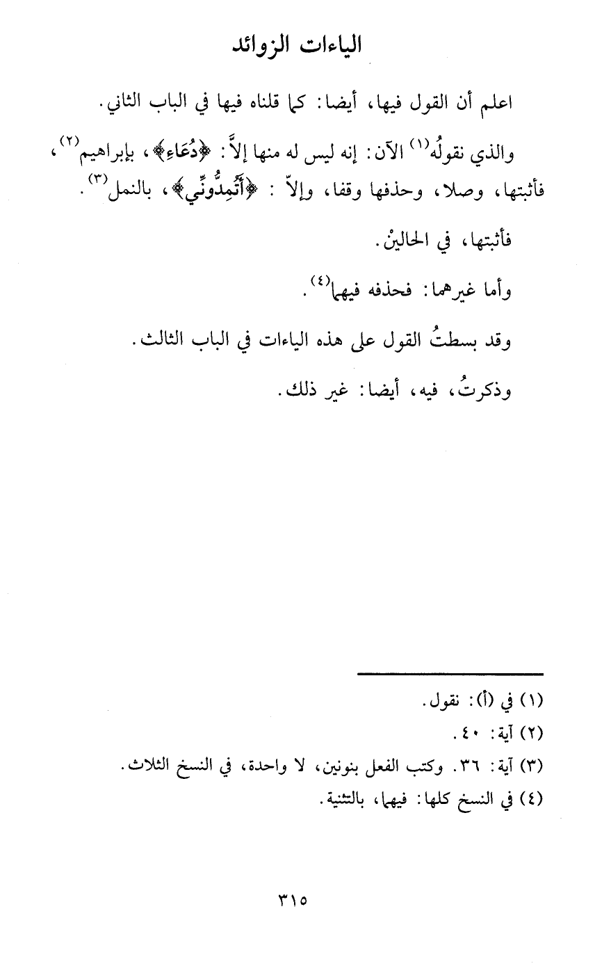 وَالَّذِي نقُوله الْآن: إِنَّه لَيْسَ لَهُ مِنْهَا إِلَّا: {دُعَاء} ، بإبراهيم، فأثبتها، وصلا، وحذفها وَقفا، وَإِلَّا: {أتمدوني} ، بالنمل؟ فأثبتها، فِي الْحَالين. وَأما غَيرهمَا: فَحَذفهُ فيهمَا.