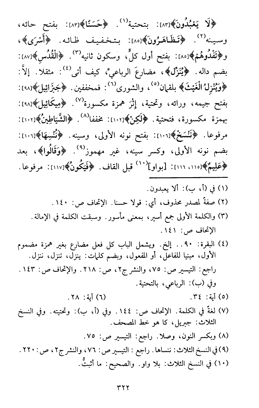 {لَا يعْبدُونَ} : بتحتية. {حسنا} : بِفَتْح حائه، وسينه. {تظاهرون} : بتَخْفِيف ظائه. {أسرى} ، و {تفدوهم} : بِفَتْح أول كل، وَسُكُون ثَانِيه. {الْقُدس} : بِضَم داله. {ينزل} ، مضارع الرباعي، كَيفَ أَتَى: مُثقلًا. إِلَّا: {وَينزل الْغَيْث} بلقمان، والشورى: فمخففين. {جِبْرَائِيل} : بِفَتْح جيمه، وَرَائه، وتحتية، إِثْر همزَة مَكْسُورَة. {مِيكَائِيل} : بِهَمْزَة مَكْسُورَة، فتحتية. {لَكِن} : مخففا. {الشَّيَاطِين} : مَرْفُوعا. {ننسخ} : بِفَتْح نونه الأولى، وسينه. {ننسها} : بِضَم نونه الأولى، وَكسر سينه، غير مَهْمُوز. {وَقَالُوا} ، بعد {عليم} : [بواو] قبل الْقَاف. {فَيكون} : مَرْفُوعا.