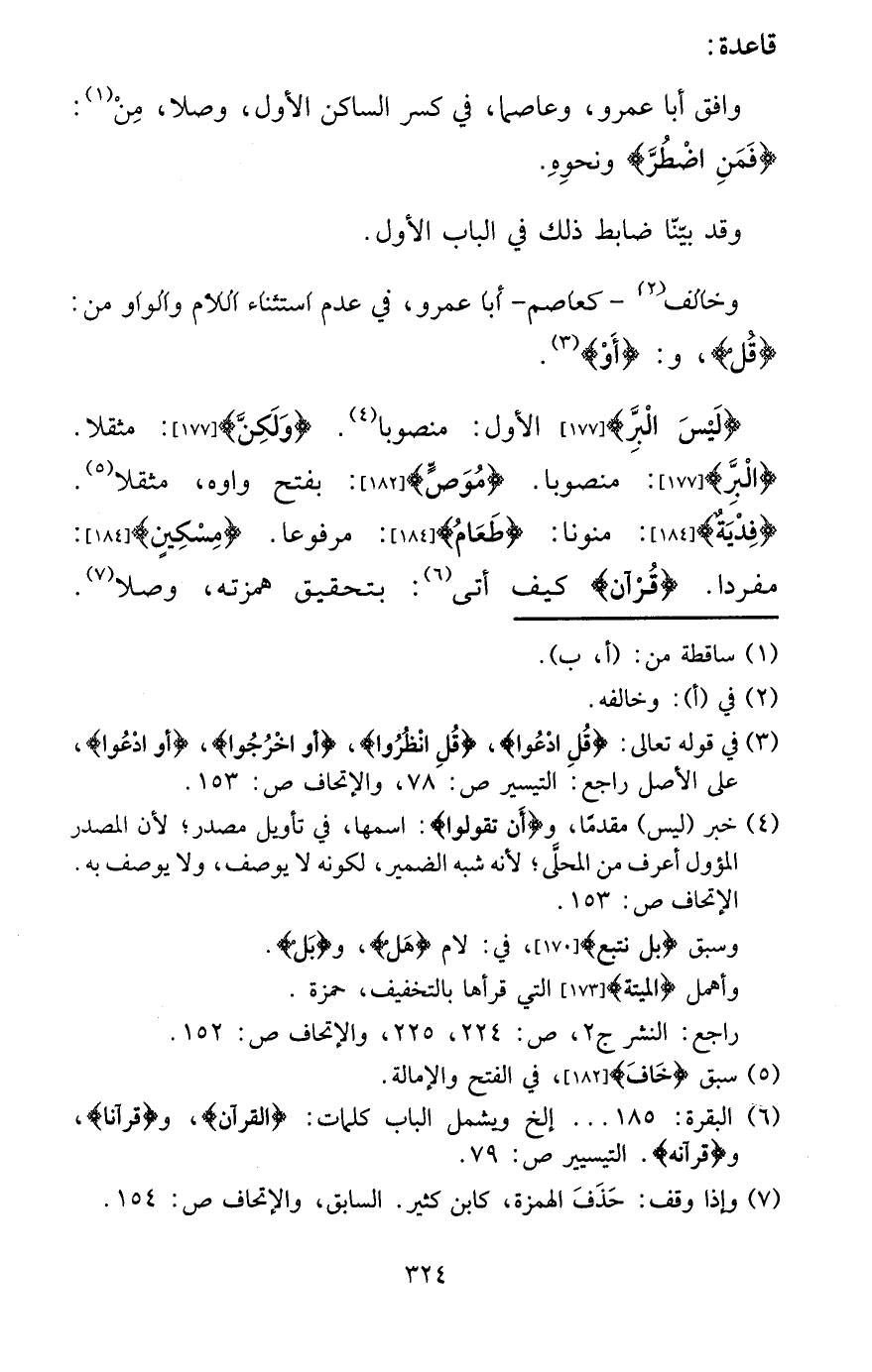 {لَيْسَ الْبر} الأول: مَنْصُوبًا. {وَلَكِن} : مُثقلًا. {الْبر} : مَنْصُوبًا. {موص} : بِفَتْح واوه، مُثقلًا. {فديَة} : منونا: {طَعَام} : مَرْفُوعا. {مِسْكين} : مُفردا. {قُرْآن} كَيفَ أَتَى: بتحقيق همزته، وصلا.