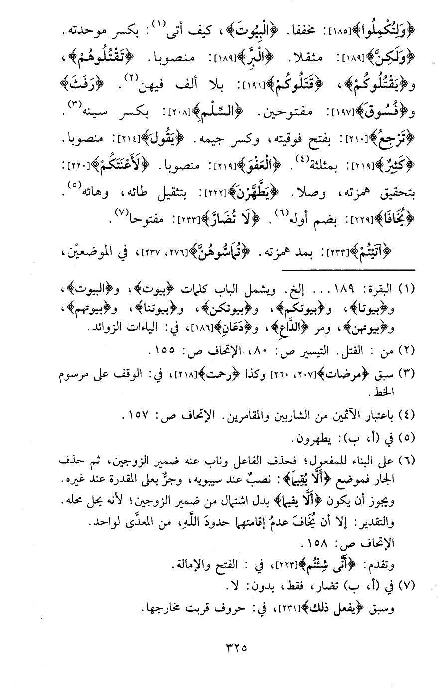 {ولتكملوا} : مخففا. {الْبيُوت} ، كَيفَ أَتَى: بِكَسْر موحدته. {وَلَكِن} : مُثقلًا. {الْبر} : مَنْصُوبًا. {تَقْتُلُوهُمْ} ، و {يقتلوكم} ، {قتلوكم} : بِلَا ألف فِيهِنَّ. {رفث} و {فسوق} : مفتوحين. {السّلم} : بِكَسْر سينه. {ترجع} : بِفَتْح فوقيته، وَكسر جيمه. {يَقُول} : مَنْصُوبًا. {كثير} : بمثلثة. {الْعَفو} : مَنْصُوبًا. {لأعنتكم} : بتحقيق همزته، وصلا. {يطهرن} : بتثقيل طائه، وهائه. {يخافا} : بِضَم أَوله. {لَا تضار} : مَفْتُوحًا.