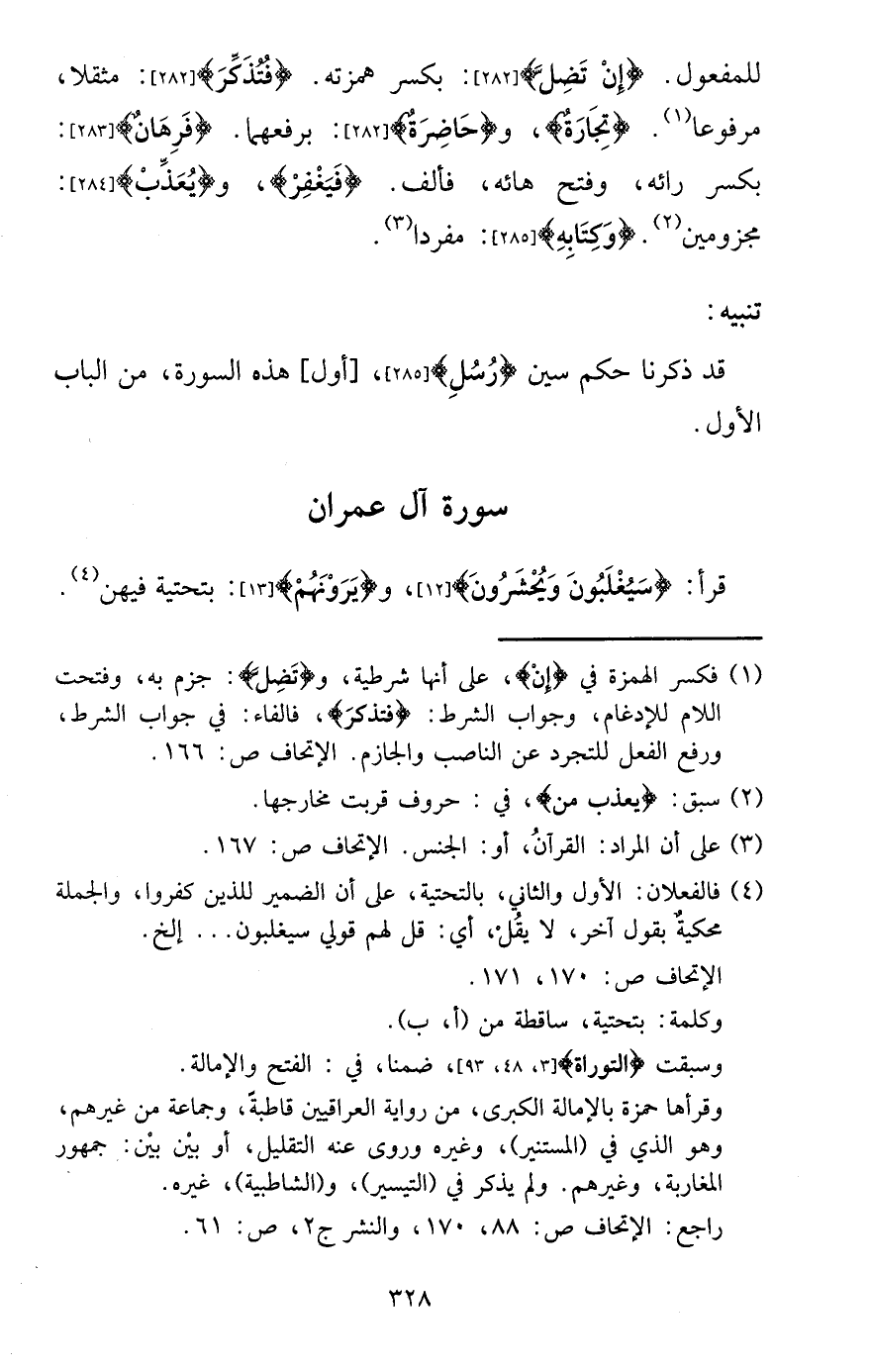 للْمَفْعُول. {أَن تضل} : بِكَسْر همزته. {فَتذكر} : مُثقلًا، مَرْفُوعا. {تِجَارَة} ، و {حَاضِرَة} : برفعهما. {فرهان} : بِكَسْر رائه، وَفتح هائه، فألف. {فَيغْفر} ، و {يعذب} : مجزومين. {وَكتابه} : مُفردا.