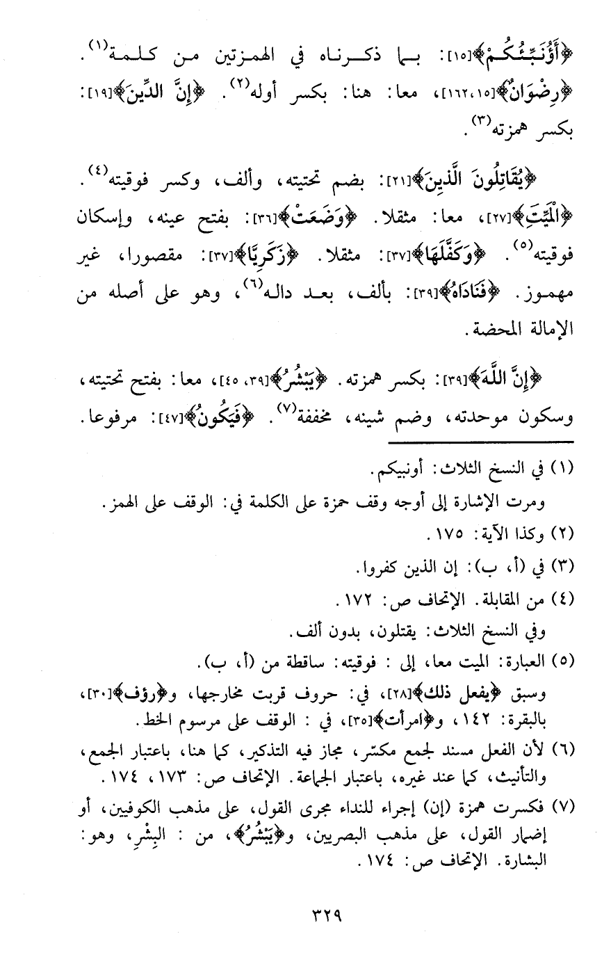 {يُقَاتلُون الَّذين} : بِضَم تحتيته، وَألف، وَكسر فوقيته. {الْمَيِّت} ، مَعًا: مُثقلًا. {وضعت} : بِفَتْح عينه، وَإِسْكَان فوقيته. {وكفلها} : مُثقلًا. {زَكَرِيَّا} : مَقْصُورا، غير مَهْمُوز. {فناداه} : بِأَلف، بعد داله، وَهُوَ على أَصله من الإمالة الْمَحْضَة.