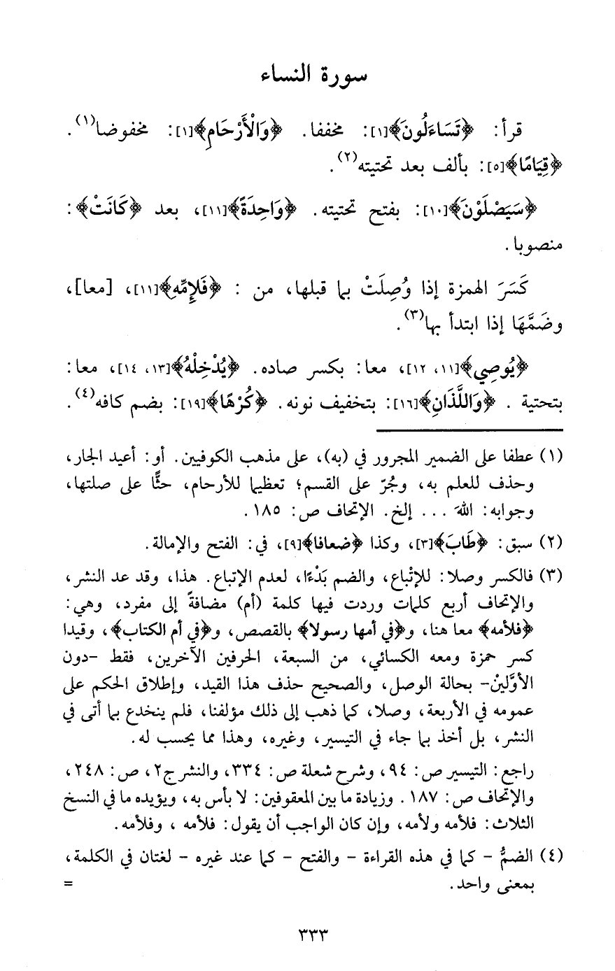 {يُوصي} ، مَعًا: بِكَسْر صَاده. {يدْخلهُ} ، مَعًا: بتحتية. {واللذان} : بتَخْفِيف نونه. {كرها} : بِضَم كافه.