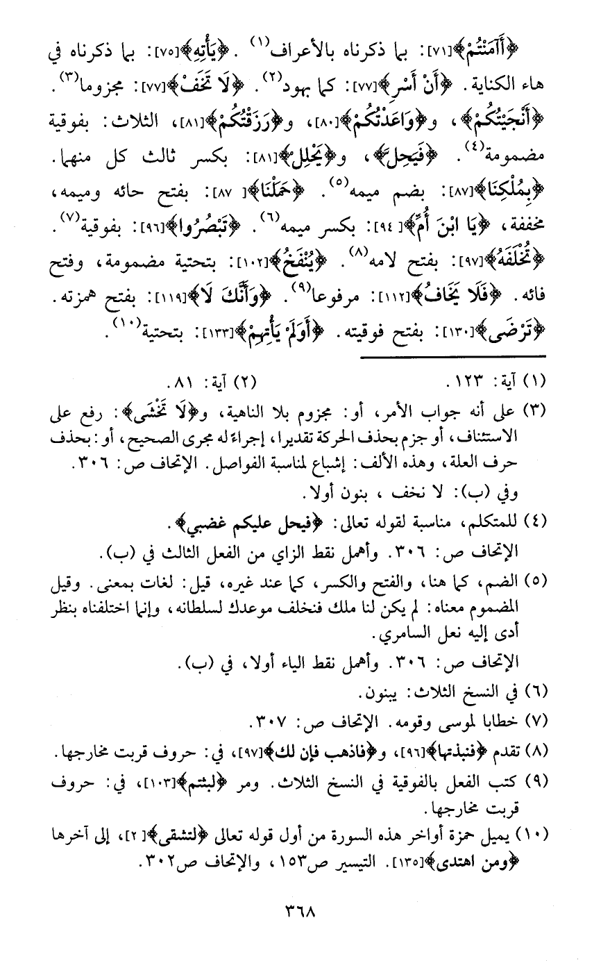 {أآمنتم} : بِمَا ذَكرْنَاهُ بالأعراف. {يَأْته} : بِمَا ذَكرْنَاهُ فِي هَاء الْكِنَايَة. {أَن أسر} : كَمَا بهود. {لَا تخف} : مَجْزُومًا. {أنجيتكم} ، و {واعدتكم} ، و {رزقتكم} ، الثَّلَاث: بفوقية مَضْمُومَة. {فَيحل} ، و {يحلل} : بِكَسْر ثَالِث كل مِنْهُمَا. {بملكنا} : بِضَم ميمه. {حملنَا} : بِفَتْح حائه وميمه، مُخَفّفَة، {يَا ابْن أم} : بِكَسْر ميمه. {تبصروا} : بفوقية. {تخلفه} : بِفَتْح لامه. {ينْفخ} : بتحتية مَضْمُومَة، وَفتح فائه. {فَلَا يخَاف} : مَرْفُوعا. {وَأَنَّك لَا} : بِفَتْح همزته. {ترْضى} : بِفَتْح فوقيته. {أولم يَأْتهمْ} : بتحتية.