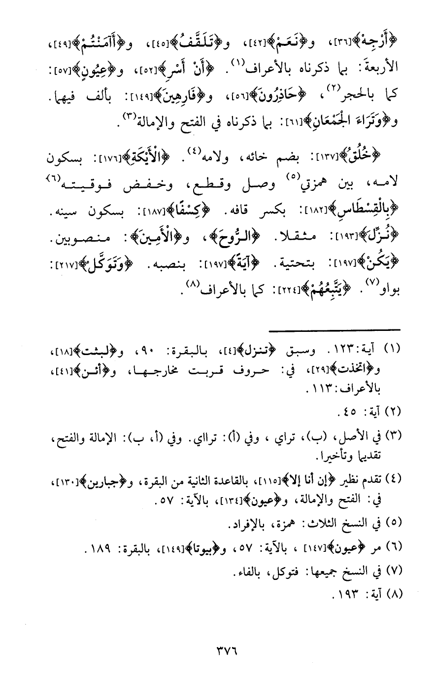 {خلق} : بِضَم خائه، ولامه. {الأيكة} : بِسُكُون لامه، بَين همزتي وصل وَقطع، وخفض فوقيته {بالقسطاس} : بِكَسْر قافه. {كسفا} : بِسُكُون سينه. {نزل} : مُثقلًا. {الرّوح} ، و {الْأمين} : منصوبين. {يكن} : بتحتية. {آيَة} : بنصبه. {وتوكل} : بواو. {يتبعهُم} : كَمَا بالأعراف.