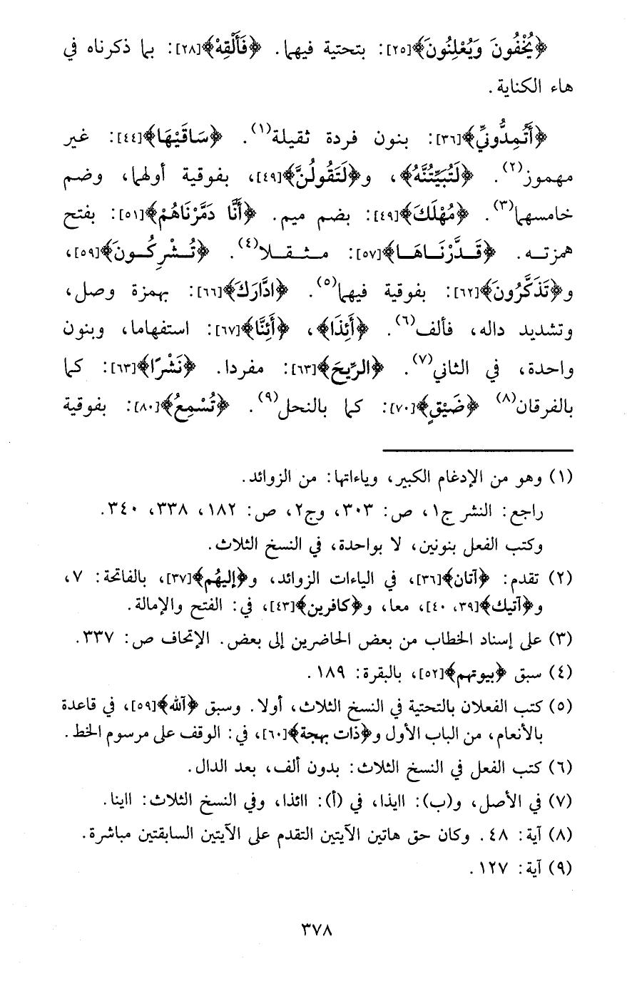 {أتمدوني} : بنُون فردة ثَقيلَة. {سَاقيهَا} : غير مَهْمُوز. {لتبيتنه} ، و {لتقولن} ، بفوقية أَولهمَا، وَضم خامسهما. {مهلك} : بِضَم مِيم. {أَنا دمرناهم} : بِفَتْح همزته. {قدرناها} : مُثقلًا. {تشركون} ، و {تذكرُونَ} : بفوقية فيهمَا. {ادارك} : بِهَمْزَة وصل، وَتَشْديد داله، فألف. {أئذا} ، {أئنا} : استفهاما، وبنون وَاحِدَة، فِي الثَّانِي. {الرّيح} : مُفردا. {نشرا} : كَمَا بالفرقان {ضيق} : كَمَا بالنحل. {تسمع} : بفوقية