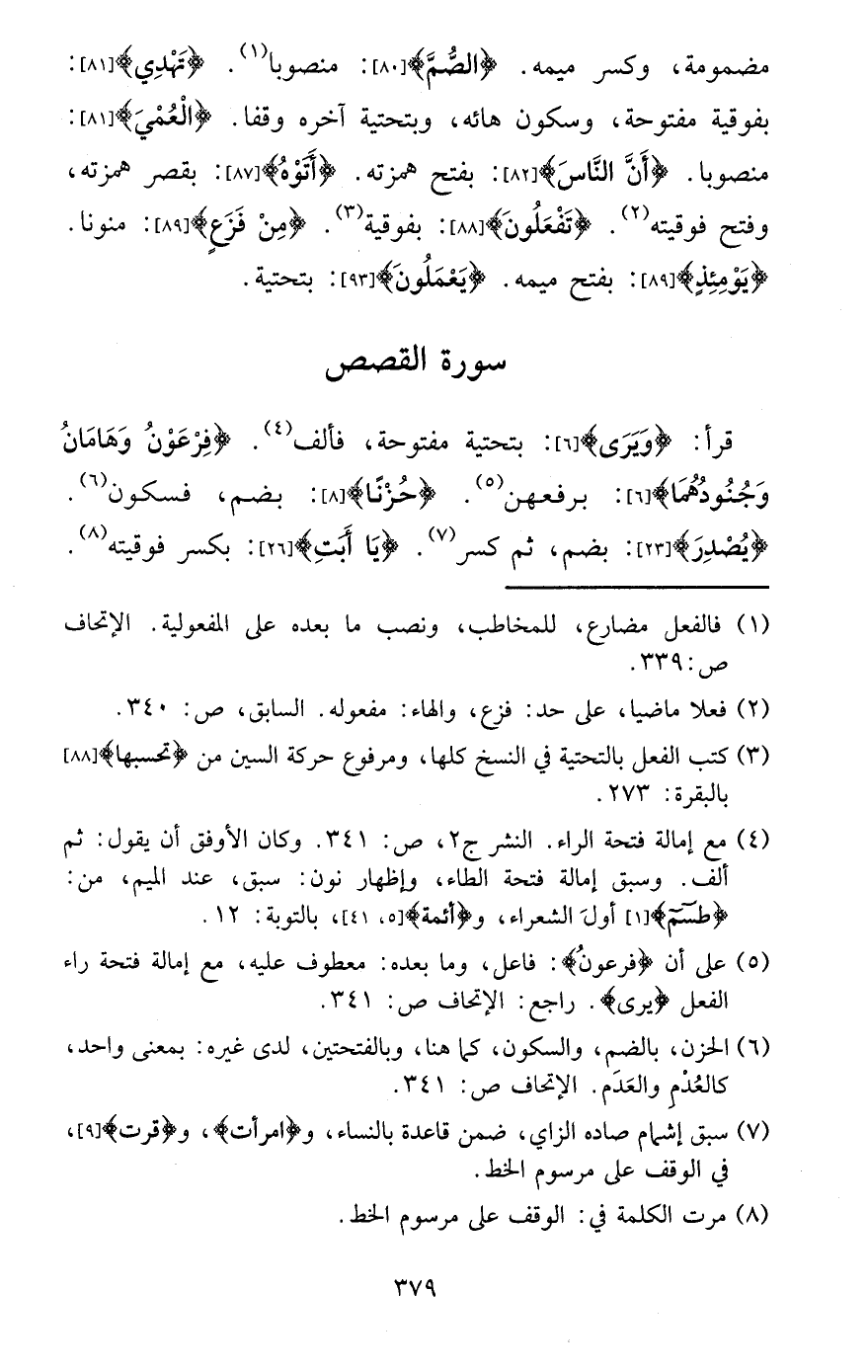 قَرَأَ: {وَيرى} : بتحتية مَفْتُوحَة، فألف. {فِرْعَوْن وهامان وجنودهما} : برفعهن. {حزنا} : بِضَم، فَسُكُون. {يصدر} : بِضَم، ثمَّ كسر. {يَا أَبَت} : بِكَسْر فوقيته.
