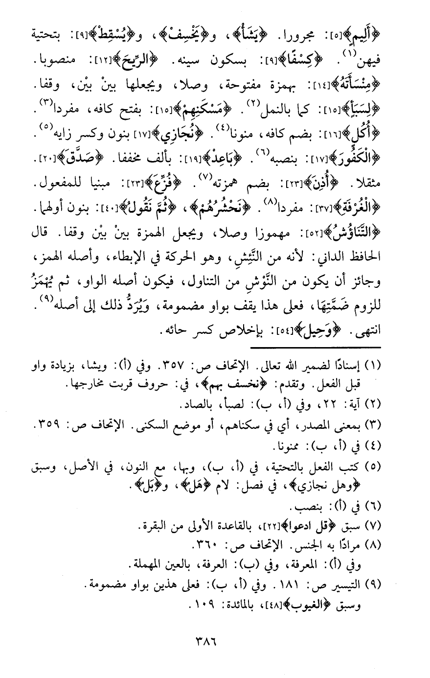 {أَلِيم} : مجرورا. {يَشَأْ} ، و {يخسف} ، و {يسْقط} : بتحتية فِيهِنَّ. {كسفا} : بِسُكُون سينه. {الرّيح} : مَنْصُوبًا. {منسأته} : بِهَمْزَة مَفْتُوحَة، وصلا، ويجعلها بَين بَين، وَقفا. {لسبأ} : كَمَا بالنمل. {مسكنهم} : بِفَتْح كافه، مُفردا. {أكل} : بِضَم كافه، منونا. {نجازي} بنُون وَكسر زايه. {الكفور} : بنصبه. {باعد} : بِأَلف مخففا. {صدق} . مُثقلًا. {أذن} : بِضَم همزته. {فزع} : مَبْنِيا للْمَفْعُول. {الغرفة} : مُفردا. {نحشرهم} ، {ثمَّ نقُول} : بنُون أَولهمَا. {التناؤش} : مهموزا وصلا، وَيجْعَل الْهمزَة بَين بَين وَقفا. قَالَ الْحَافِظ الداني: لِأَنَّهُ من النئش، وَهُوَ الْحَرَكَة فِي الإبطاء، وَأَصله الْهَمْز، وَجَائِز أَن يكون من النوش من التَّنَاوُل، فَيكون أَصله الْوَاو، ثمَّ يهمز للُزُوم ضمتها، فعلى هَذَا يقف بواو مَضْمُومَة، وَيرد ذَلِك إِلَى أَصله. انْتهى. {وحيل} : بإخلاص كسر حائه.