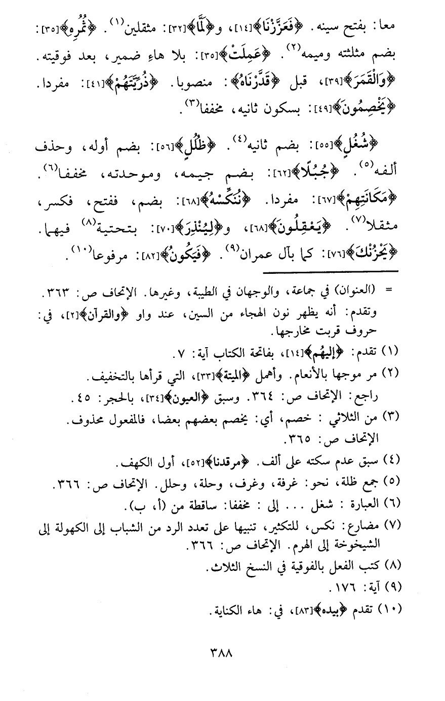 مَعًا: بِفَتْح سينه. {فعززنا} ، و {لما} : مثقلين. {ثمره} : بِضَم مثلثته وميمه. {عملت} : بِلَا هَاء ضمير، بعد فوقيته. {وَالْقَمَر} ، قبل {قدرناه} : مَنْصُوبًا. {ذُرِّيتهمْ} : مُفردا. {يخصمون} : بِسُكُون ثَانِيه مخففا.