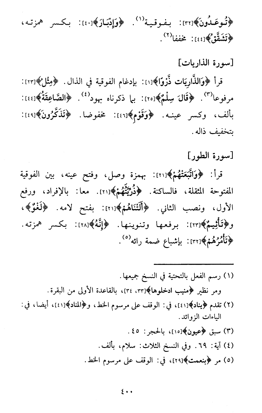 قَرَأَ: {وَاتَّبَعتهمْ} : بِهَمْزَة وصل، وَفتح عينه، بَين الْفَوْقِيَّة الْمَفْتُوحَة المثقلة، فالساكنة. {ذُرِّيتهمْ} . مَعًا: بِالْإِفْرَادِ، وَرفع الأول، وَنصب الثَّانِي. {ألتناهم} : بِفَتْح لامه. {لَغْو} ، و {تأثيم} : برفعها وتنوينها. {إِنَّه} : بِكَسْر همزته. {تَأْمُرهُمْ} : بإشباع ضمة رائه.
