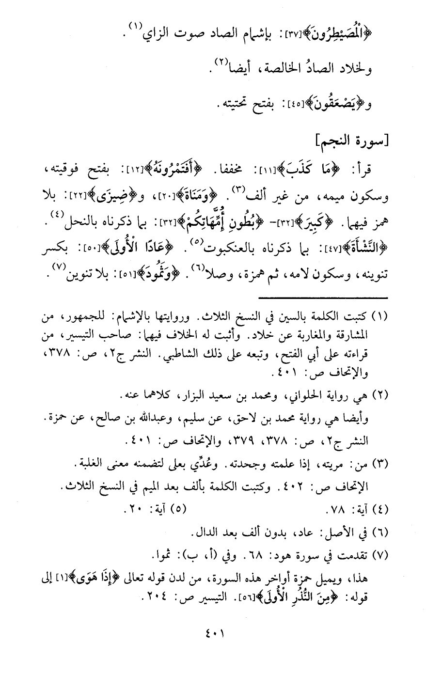 قَرَأَ: {مَا كذب} : مخففا. {أفتمرونه} : بِفَتْح فوقيته، وَسُكُون ميمه، من غير ألف. {وَمَنَاة} ، و {ضيزى} : بِلَا همز فيهمَا. {كَبِير} - {بطُون إمهاتكم} : بِمَا ذَكرْنَاهُ بالنحل. {النشأة} : بِمَا ذَكرْنَاهُ بالعنكبوت. {عادا الأولى} : بِكَسْر تنوينه، وَسُكُون لامه، ثمَّ همزَة، وصلا. {وَثَمُود} : بِلَا تَنْوِين.