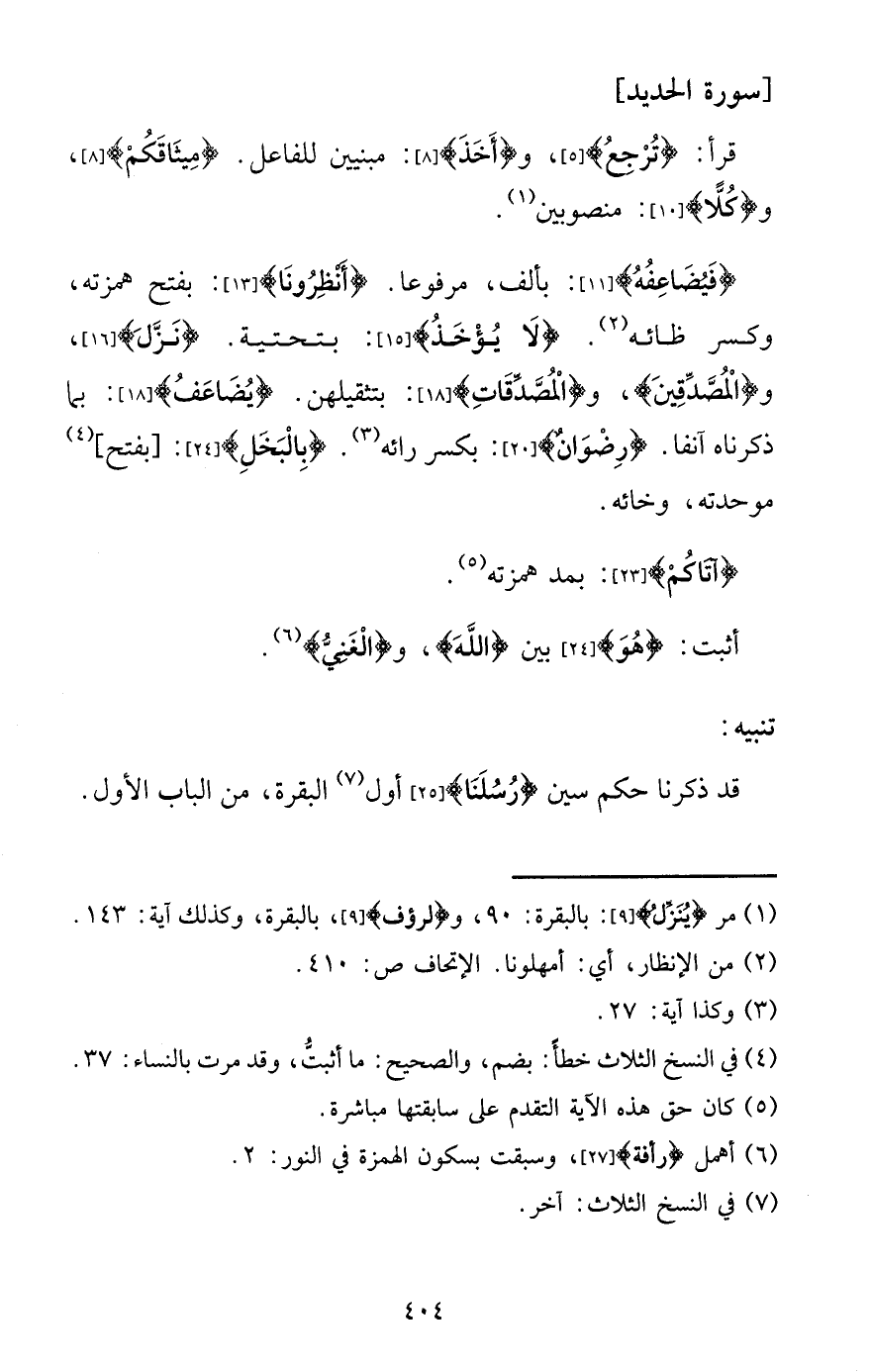 {فيضاعفه} : بِأَلف، مَرْفُوعا. {أنظرونا} : بِفَتْح همزته، وَكسر ظائه. {لَا يُؤْخَذ} : بتحتية. {نزل} ، و {المصدقين} ، و {المصدقات} : بتثقيلهن. {يُضَاعف} : بِمَا ذَكرْنَاهُ آنِفا. {رضوَان} : بِكَسْر رائه. {بالبخل} : [بِفَتْح] موحدته، وخائه.
