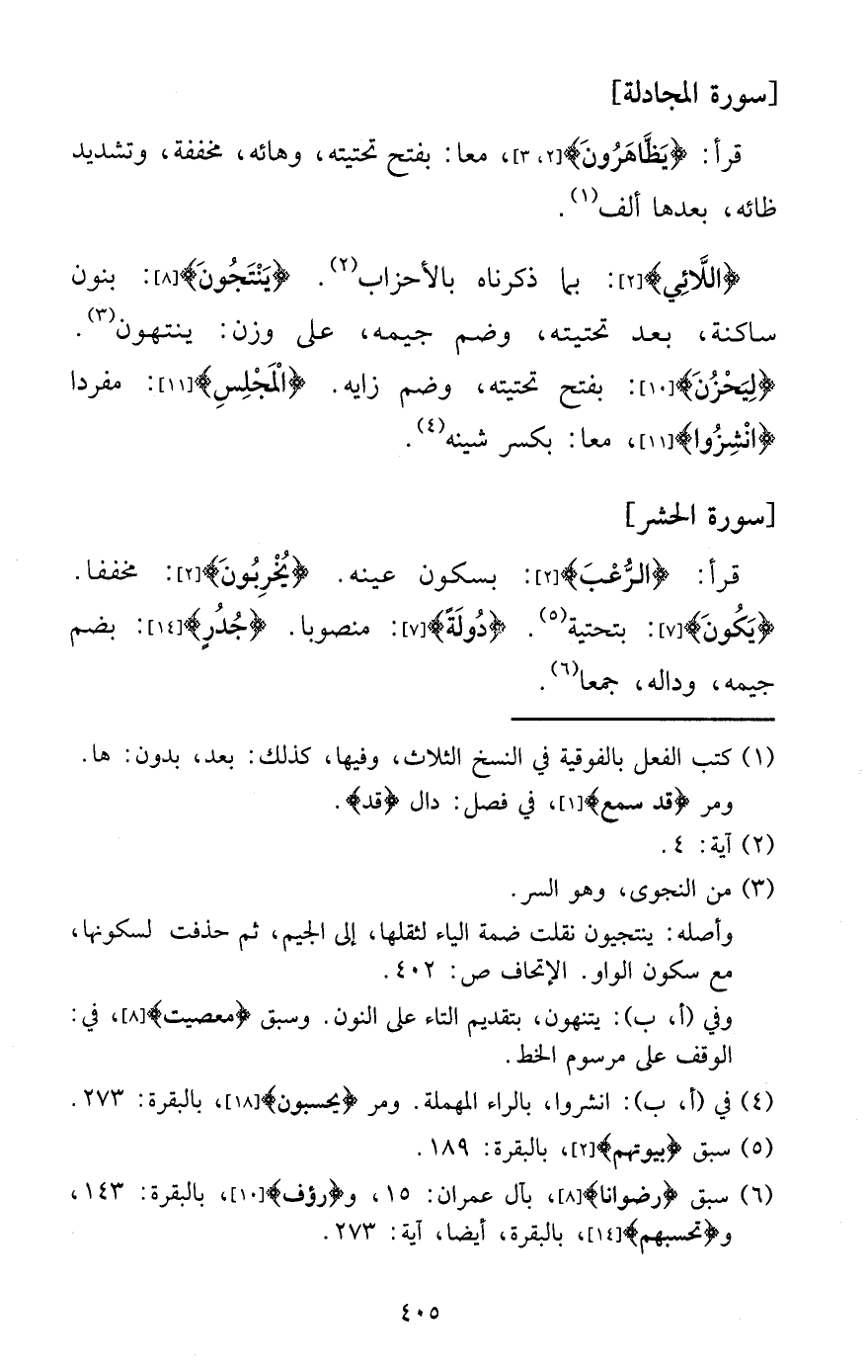 {اللائي} : بِمَا ذَكرْنَاهُ بالأحزاب. {ينتجون} : بنُون سَاكِنة، بعد تحتيته، وَضم جيمه، على وزن: ينتهون. {ليحزن} : بِفَتْح تحتيته، وَضم زايه. {الْمجْلس} : مُفردا {انشزوا} ، مَعًا: بِكَسْر شينه.