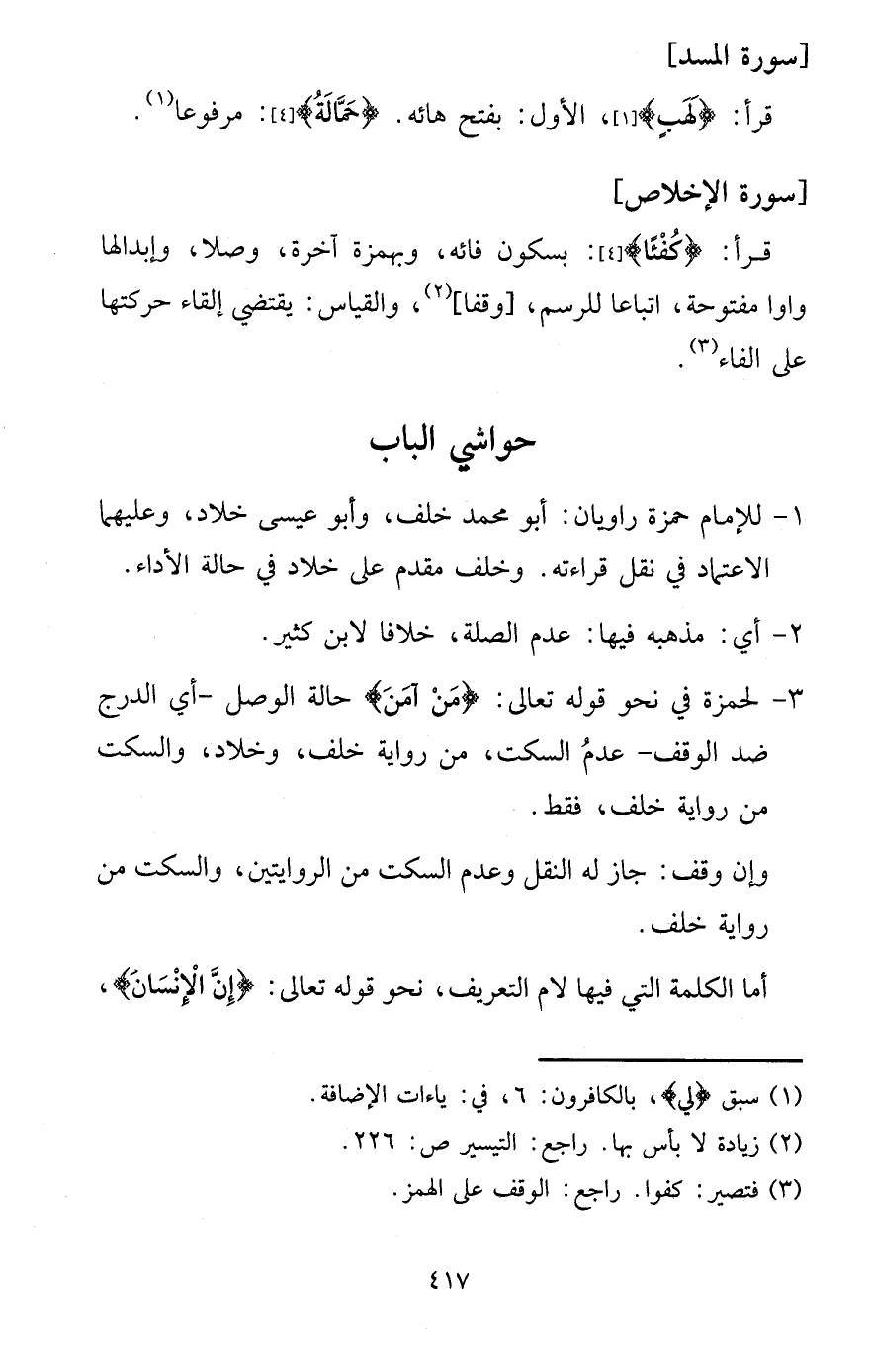 1 - للْإِمَام حَمْزَة راويان: أَبُو مُحَمَّد خلف، وَأَبُو عِيسَى خَلاد، وَعَلَيْهِمَا الِاعْتِمَاد فِي نقل قِرَاءَته. وَخلف مقدم على خَلاد فِي حَالَة الْأَدَاء.