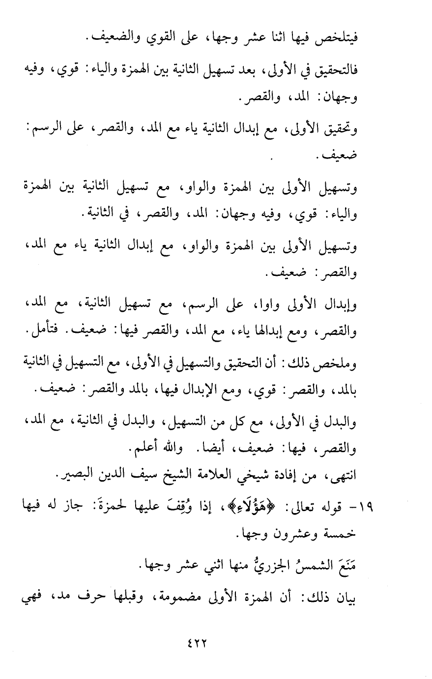 19 - قَوْله تَعَالَى: {هَؤُلَاءِ} ، إِذا وقف عَلَيْهَا لِحَمْزَة: جَازَ لَهُ فِيهَا خَمْسَة وَعِشْرُونَ وَجها. منع الشَّمْس الْجَزرِي مِنْهَا اثْنَي عشر وَجها. بَيَان ذَلِك: أَن الْهمزَة الأولى مَضْمُومَة، وَقبلهَا حرف مد، فَهِيَ