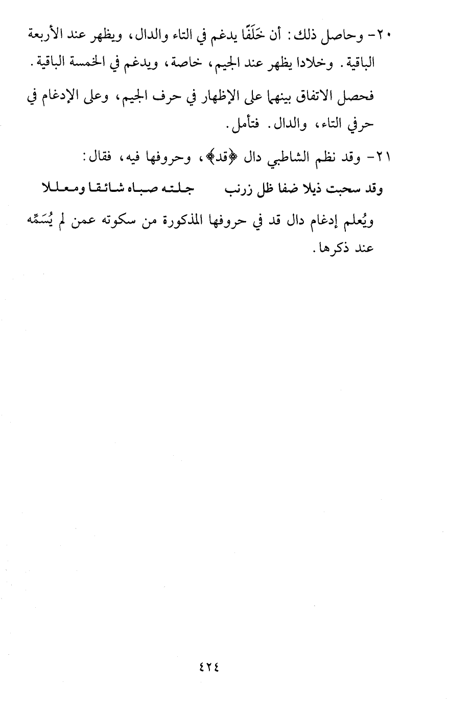 20 - وَحَاصِل ذَلِك: أَن خلفا يدغم فِي التَّاء وَالدَّال، وَيظْهر عِنْد الْأَرْبَعَة الْبَاقِيَة. وخلادا يظْهر عِنْد الْجِيم، خَاصَّة، ويدغم فِي الْخَمْسَة الْبَاقِيَة. فَحصل الِاتِّفَاق بَينهمَا على الْإِظْهَار فِي حرف الْجِيم، وعَلى الْإِدْغَام فِي حرفي التَّاء، وَالدَّال. فَتَأمل.