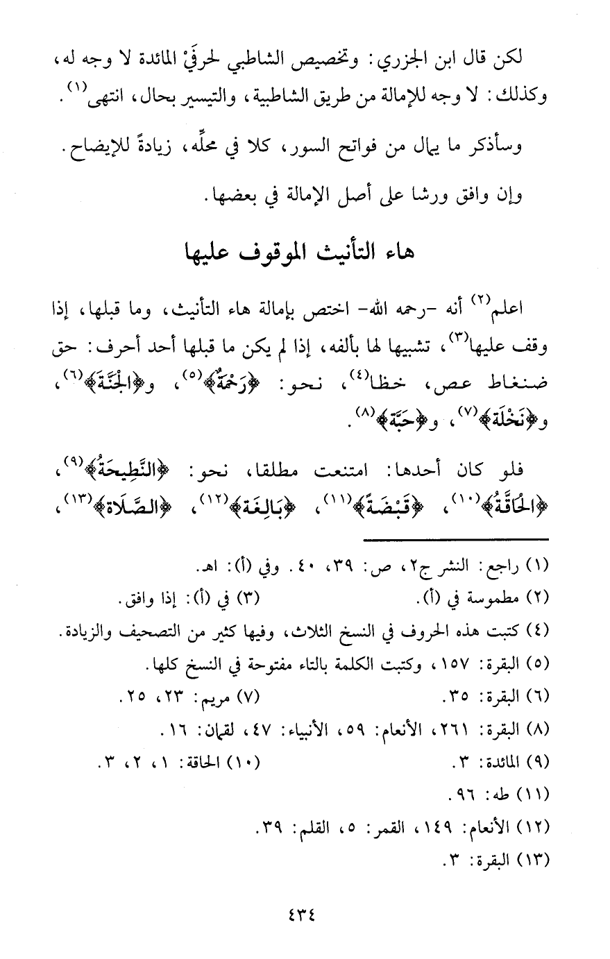 اعْلَم أَنه - رَحمَه الله - اخْتصَّ بإمالة هَاء التَّأْنِيث، وَمَا قبلهَا، إِذا وقف عَلَيْهَا، تَشْبِيها لَهَا بألفه، إِذا لم يكن مَا قبلهَا أحد أحرف: حق ضنغاط عص، خظا، نَحْو: {رَحْمَة} ، و {الْجنَّة} ، و {نَخْلَة} ، و {حَبَّة} .