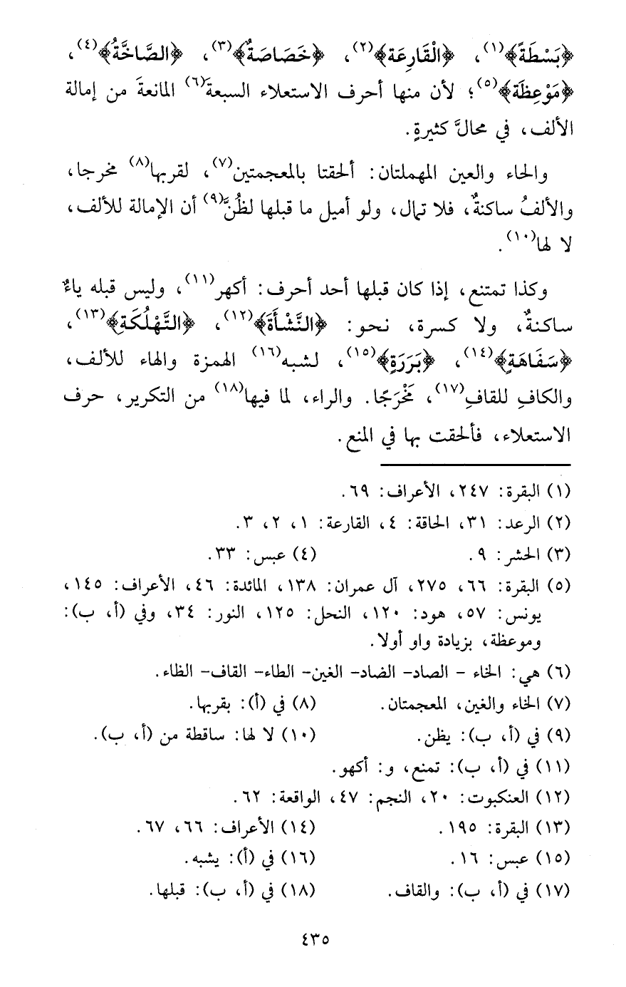 {بسطة} ، {القارعة} ، {خصَاصَة} ، {الصاخة} ، {موعظة} ؛ لِأَن مِنْهَا أحرف الاستعلاء السَّبْعَة الْمَانِعَة من إمالة الْألف، فِي محَال كَثِيرَة.